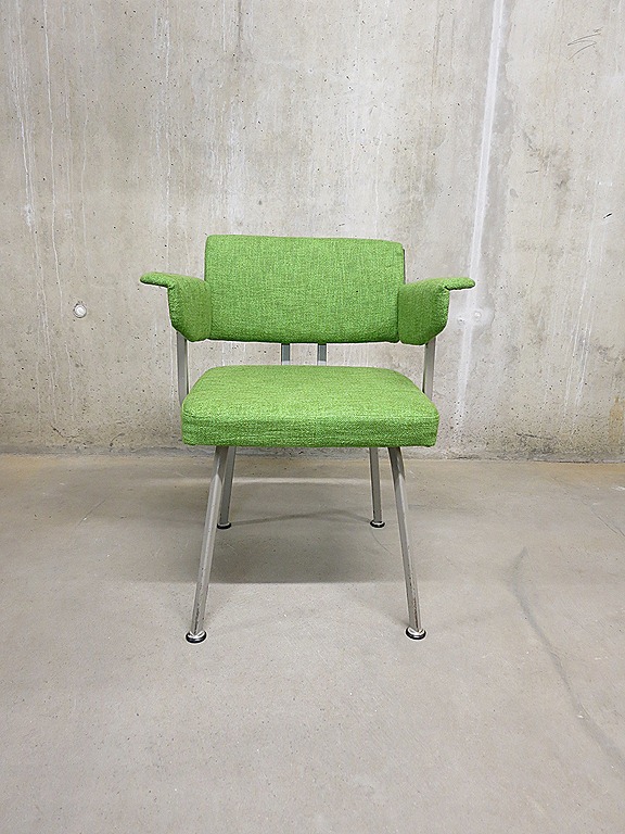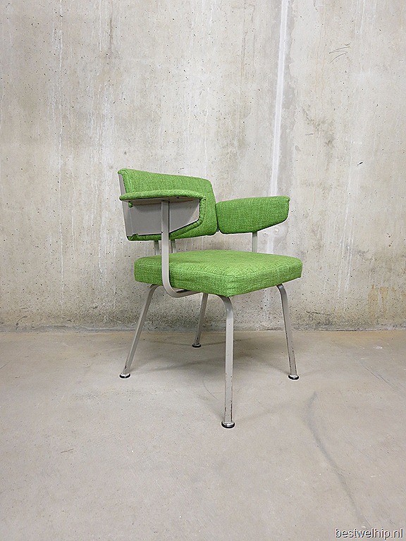 Te gekke industriële bureaustoel, een Nederlands ontwerp van Friso Kramer. Model: Resort. Producent: Ahrend de Cirkel. Periode: ontworpen in 1960. Friso Kramer is bekend om zijn ergonomische zit en stoer industrieel ontwerp. Periode: jaren 50. Materiaal: licht grijs metalen frame en volledig opnieuw gestoffeerde zitting in lime groen. Afmetingen: H0.76 x B0.63 x D0.54 cm. Breedte zitvlak 0.49 cm, zithoogte is 0.46 cm. Prachtig aan een bureau ( en in het bijzonder het Friso Kramer bureau) Zeer mooi in zowel een modern als in een industrieel / vintage interieur. Prijs: verkocht