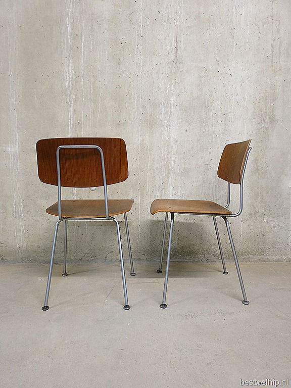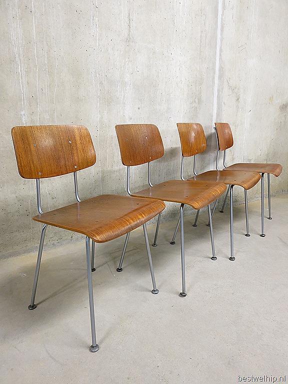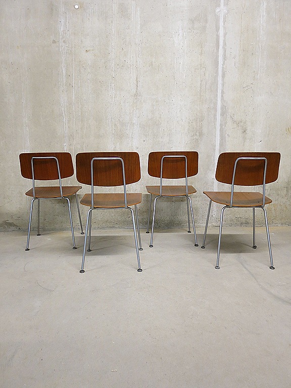 Een zeer geliefde & zeldzame vintage design eetkamer set van 4 industriële Gispen stoelen. Deze stoelen zijn origineel van Gispen ontworpen door A.R. Cordemeijer, periode jaren 60. Aan de achterzijde van de rugleuning vormt het frame een handgreep. De stoelen hebben een massieve chroom metalen buisframe en een gelamineerde houten zitting en rugleuning. De stoelen verkeren in een goede vintage staat. Afmeting stoel: H79 x B 43 cm, zithoogte 46,5 cm. Super mooi contrast tussen de het warme hout en het metalen chromen frame. Een bijzondere set voor in de woonkamer. Prijs: verkocht