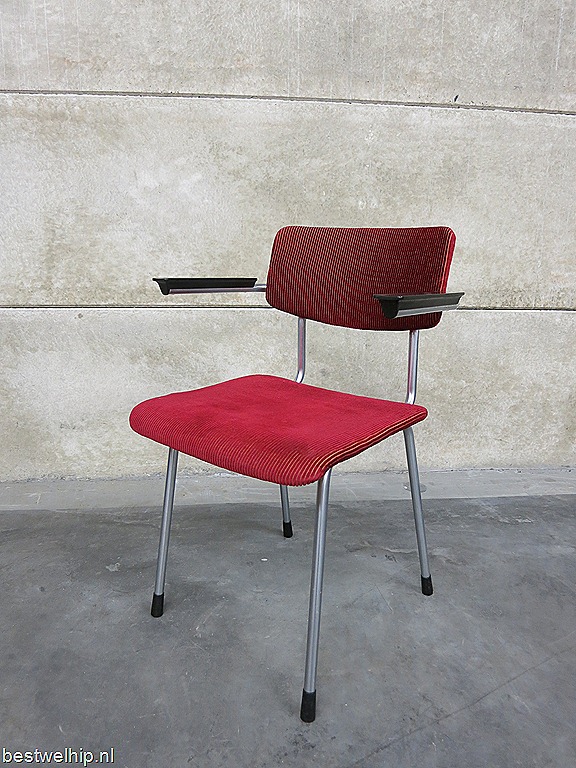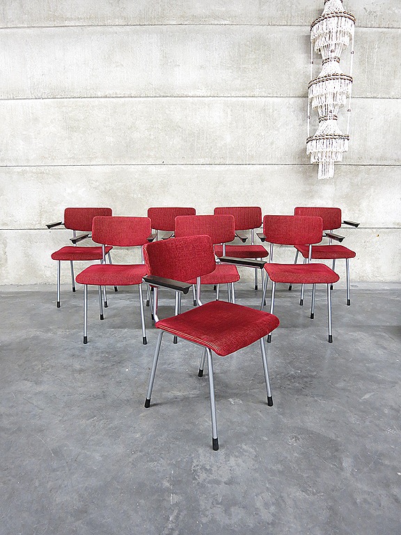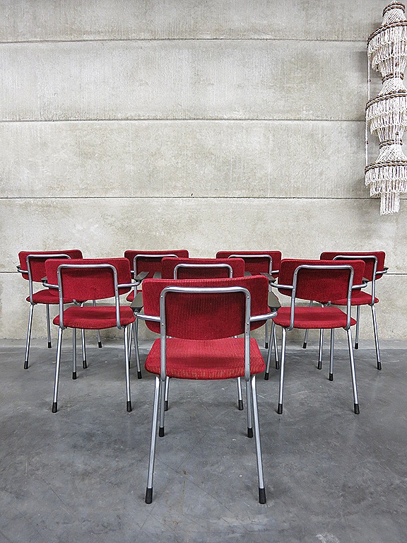 Prachtige originele set van 8 vintage design eetkamer stoelen van Gispen Cordemijer model 1235, een ontwerp uit de jaren 50. Materiaal: chromen buizen frame & bakelieten armleggers, rode ribstof. De stof is nog origineel, deze is in goede vintage staat. Uiteraard altijd eenvoudig te stofferen naar eigen smaak. Deze stoelen zijn tijdloos en hebben een zeer comfortabele zit. Mooi in deze grote set van 8 identieke vintage eetkamer stoelen.