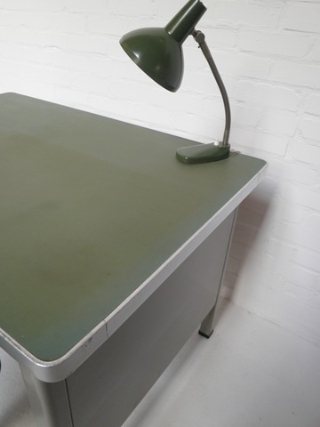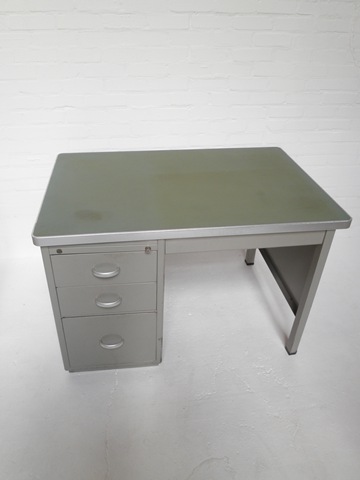 Absoluut een prachtig exemplaar is dit metalen industriële Gispen bureau. Model nummer 7731 opgenomen in het archief van de Gispen collectie. Ontworpen door het ontwerpbureau N.V. Gispen in de jaren 50. Fabrikant: Gispen, Holland. Zeer speciaal door zijn ronde vormen en mosgroene linoleum blad. Dit bureau heeft 3 lades en is voorzien van dezelfde bolvormige geanodiseerde aluminium handgrepen als het Gispen president bureau. Links voor: gemekt met origineel Gispen logo. Het bureau is voorzien van een zij-en achterschot. Afmetingen: B1.20 x H78 x D78 cm. Gezien de leeftijd nog in goede vintage staat. Dit metalen bureau is een must have voor de liefhebber! Prijs: verkocht