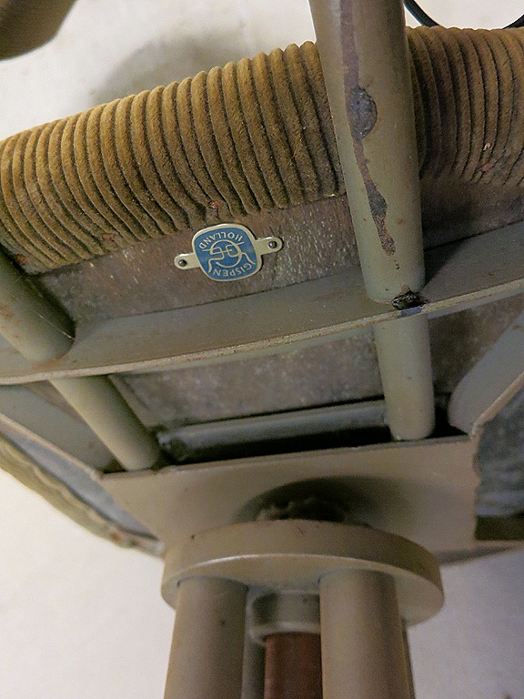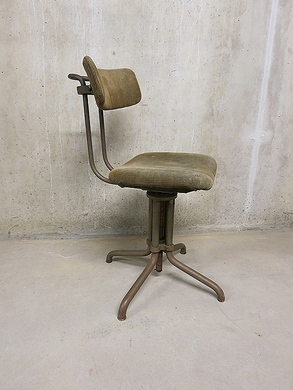 Een van de eerste modellen ‘vier-poots bureaustoel’ van Gispen. Periode: jaren 50. De rugleuning scharniert en is in hoogte verstelbaar. Herkenbaar aan de stoere stalen poten die in het midden van de stoel geschroefd zijn aan een gemoffelde stalen plaat. De zitting is van multiplex en aan dit stalen middenstuk bevestigd. De stoel is nog bekleed met de originele stoffering van groen/grijs velours. Onderkant is voorzien van het originele Gispen logo. Gezien de leeftijd in goed gebruikte vintage staat. Absoluut stoer om neer te zetten & een lust voor het oog. Ontbreekt deze nog in je verzameling. Prijs: verkocht