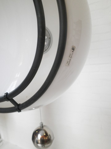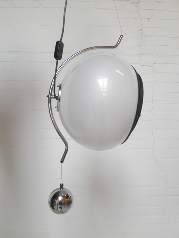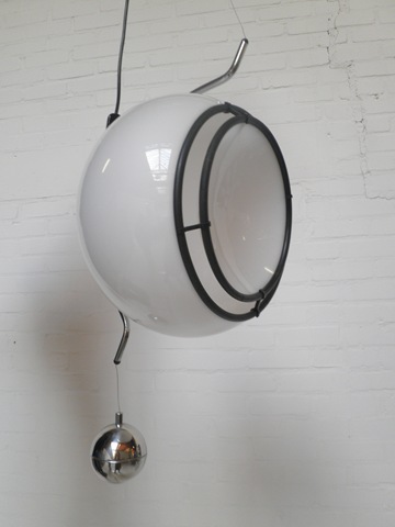 Een bijzonder zeldzaam exemplaar is deze Harvey Guzinni hanglamp. Made in Italy. Periode: sixties, space age. Nog voorzien van originele sticker. Totale hoogte 1.20 cm, diameter 38 cm. Deze lamp geeft door zijn ‘zwevend’ karakter een ruimtelijk effect. Vanuit de bol lopen een stalen kabel en het snoer naar boven, waar een wit plafondkapje zit. De hoogte is eventueel te verstellen. Materiaal kap: wit acryl. Nog in zeer goede vintage staat. Door zijn schitterende vormgeving is het een eyecatcher in ieder interieur. Als de lamp aan is verspreid deze lamp een mooi diffuus licht. Hangt dit schitterend exemplaar straks bij jouw in de woonkamer? Prijs: verkocht