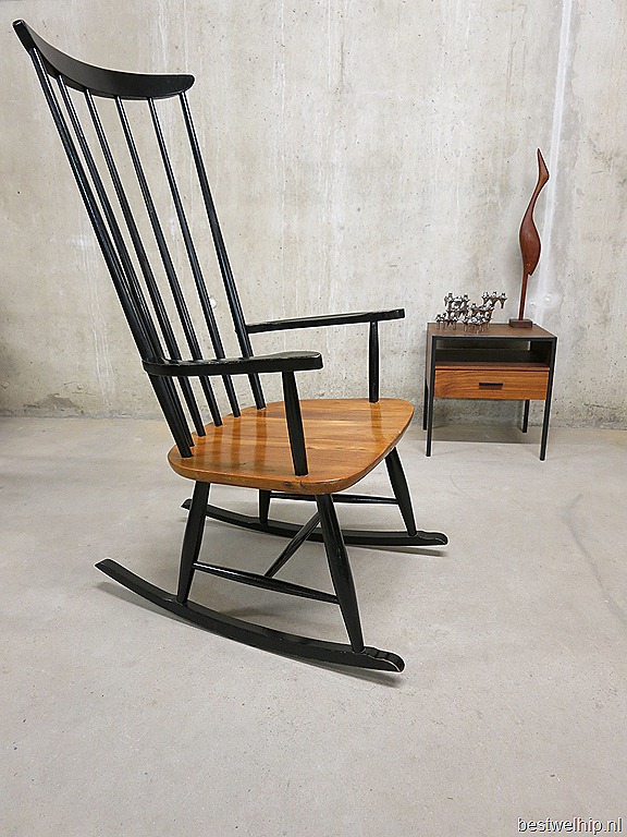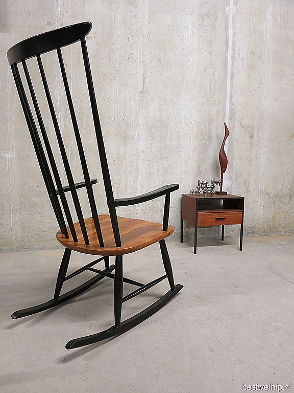 Zeldzame vintage houten schommelstoel. Ontwerper: onbekend Pastoe/ Tapiovaara stijl. Periode: jaren 60. Kleur: zwarte spijlen met houten zitting . Afmetingen: B0.57 x H1.18 x D0.76 cm. Zithoogte is 0.41 cm en zitdiepte is 0.48 cm. Gezien de leeftijd nog in goede vintage staat. Heerlijk voor de openhaard of om de krant in te lezen. Prijs: verkocht