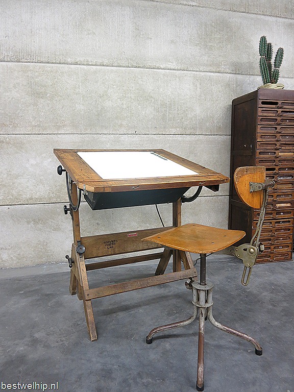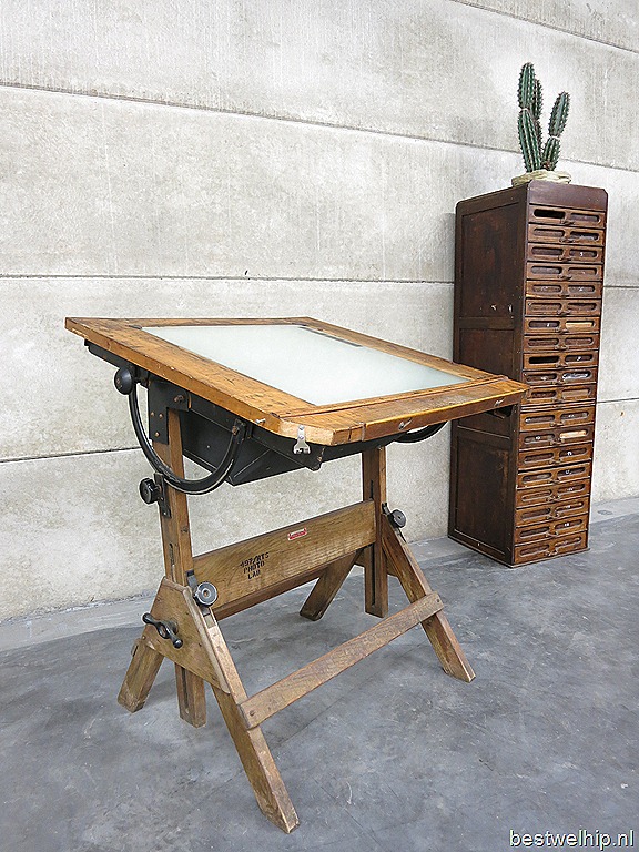 Unieke industriële vintage tekentafel uit 1930 made by Hamilton. Gemerkt op de poot. Prachtige zwart metalen ijzeren knoppen in mooie patina met eiken houten frame. In hoogte verstelbaar. Ook als tekentafel bureau tafel of als lamp te gebruiken. Afmetingen blad: H79 x B81 cm. De tafel is in hoogte variabel (stand van de foto is 1 mtr ) Een stoer en industrieel exemplaar. Absoluut een object in de kamer! Prijs: verkocht