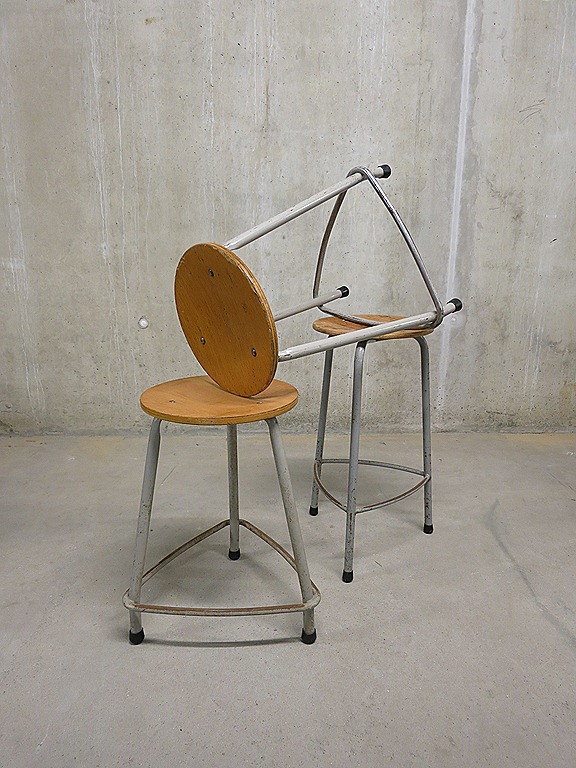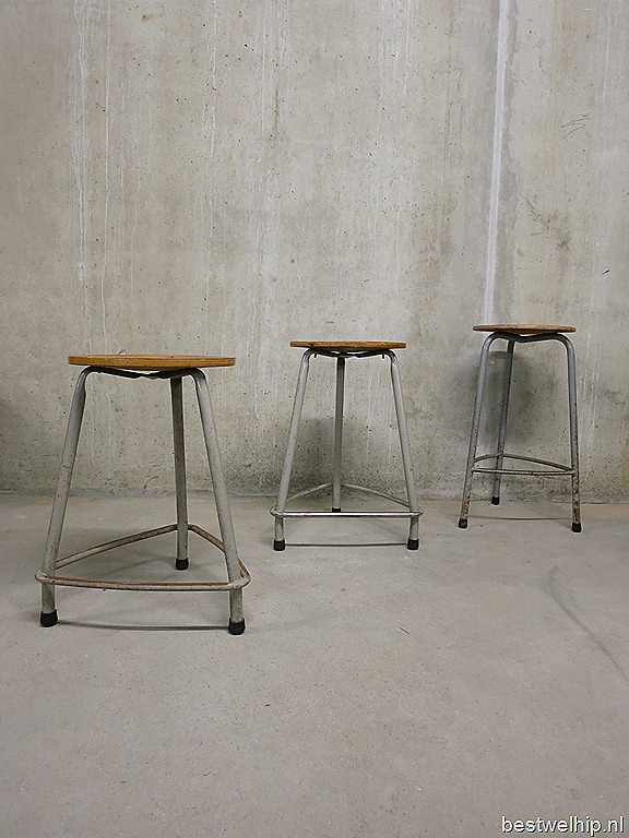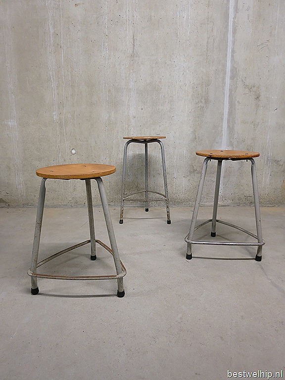 Stoere industriële vintage atelierkrukken in 3 verschillende hoogte van Ahrend de Cirkel. Periode: 1960. Ideaal voor in een creatieve ruimte. Of gewoon voor aan een tafel of tekentafel. Materiaal: metalen frame/onderstel met driepoot, ring en stoer doorleefde houten zitting. Het doorleefde uiterlijk en de metalen ring aan de onderkant geven dit exemplaar net ‘dat’ beetje extra. Door zijn solide stevige uitvoering absoluut een onverwoestbare kruk. Mooi om bij te zetten aan een lange robuuste tafel, geeft een industriële look.