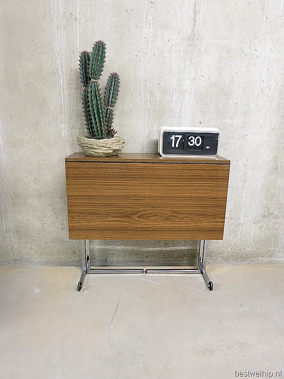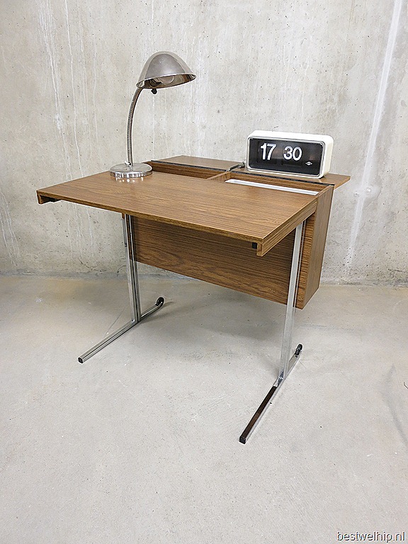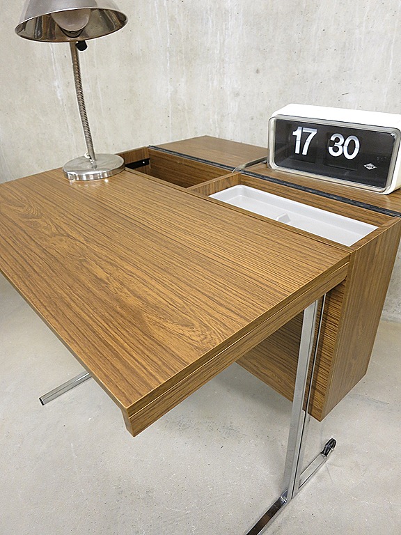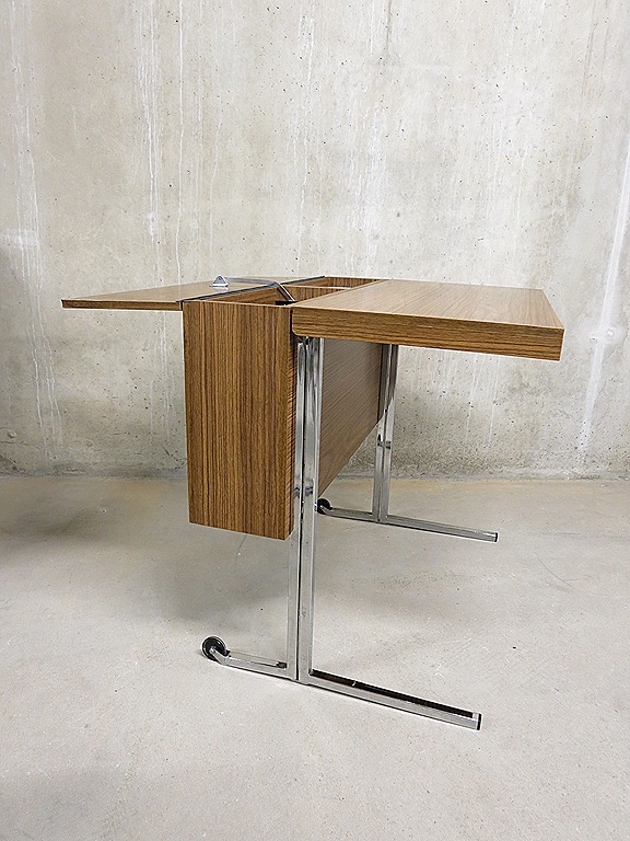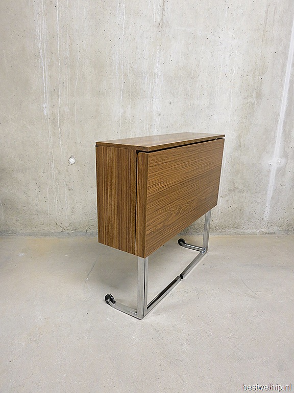 Zeldzaam industrieel opklapbaar & verrijdbaar vintage bureau. Naar alle waarschijnlijkheid een ontwerp van Pierre Guariche voor Meurop. Land van herkomst: België. Periode: jaren 60/70. Bureau in dichtgeklapte positie is te gebruiken als side table. Afmetingen: B0.77 x H0.71 cm. De dieptes variëren van ingeklapt 0.23 , half uitgeklapt 0.58 en volledig uitgeklapt 0.81 diep. Enige gebruikers sporen aan het fineer, verder in goede vintage staat. Absoluut een uniek exemplaar door zijn minimalistisch design. Prijs: verkocht