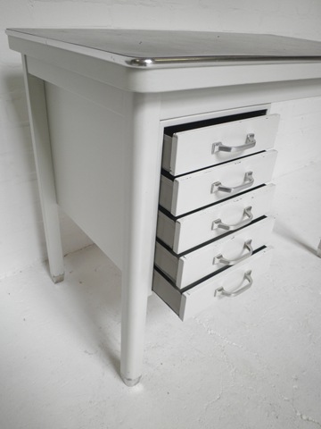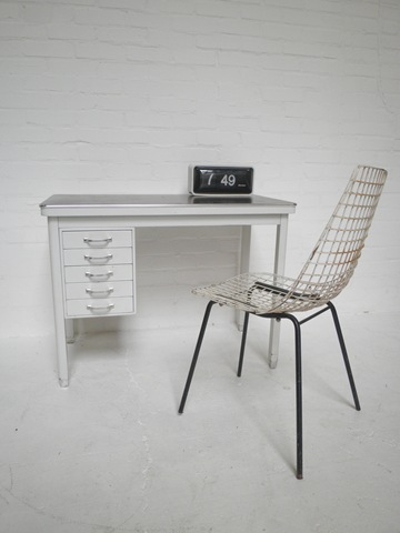 Een strak industrieel bureau uit de jaren 50 in Gispen stijl. Het bureau heeft 5 lades en een mooi donker bruin linoleum blad. Prachtig door zijn subtiele afwerkingen in metalen strip om blad, metalen grondpootjes en handvaten. Materiaal: metaal. Kleur: wit. Speciaal door zijn aparte afmetingen B95 x D50 x H70 cm. In zeer goede vintage staat. Zit jij straks achter dit bureau op je laptop te werken? Prijs: verkocht