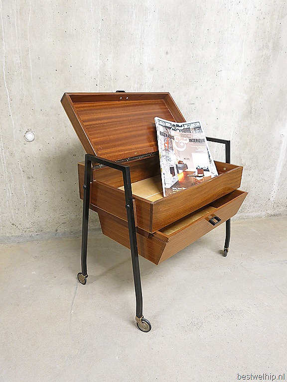 Industrieel vintage bijzettafeltje, prachtig op zijn metalen ranke poten. Een bijzonder kleur contrast tussen het hout kleurige tafeltje en de zwart metalen poten op zwenkwielen. Periode: jaren 60, sixties. Prachtig om neer te zetten in je living naast de bank als bijzettafel. Voorzien van een klep met opbergmogelijkheid & 1 schuiflade. Ideaal om je spullen in op te bergen ( zoals je afstandsbediening , papieren/tijdschriften) Dit exemplaar is qua vormgeving zeer uniek en bijzonder. Afmetingen: B0.61 X H0.55 x D0.35 cm. Gezien de leeftijd nog in goede vintage staat. Mooi door zijn eenvoud en een ‘must have’ als je oog erop gevallen is. Prijs:verkocht