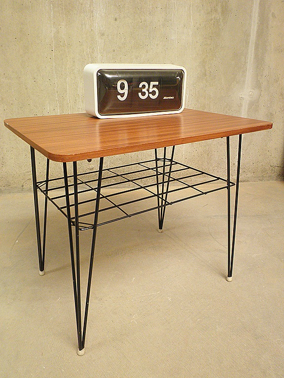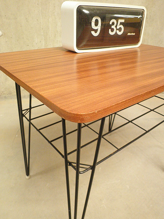 Bijzonder mooi bijzettafeltje. Zweeds design, waarschijnlijk Nisse String. Doet ook denken aan de stijl van Kees Braakman. Periode: jaren 60. Onderkant: originele sticker met een patent formulering & serienummer. Materiaal: zwaar (demontabel) metalen onderstel en houten blad met mooie houttekening. Afmetingen: B60 x D46 x H51 cm. Gezien zijn leeftijd nog in zeer goede staat. Absoluut een mooie exemplaar door zijn prachtige metalen onderstel . Een eye-catcher voor in je woonkamer. Prijs: verkocht