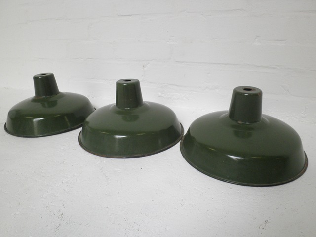 Set van 3 originele emaillen lampenkappen. Periode: jaren ‘30/’50. De buitenzijde is legergroen van kleur & de binnenzijde is wit geëmailleerd met zwarte rand. Helemaal hip voor boven de eettafel thuis en of restaurant/ verkoopruimte. Deze lamp komt oorspronkelijk uit een oude fabriekshal. Afmetingen: diameter kap is 30,5 cm en hoogte is 18 cm. Enkele plekken aan de zijkant van de kap, maar gezien de leeftijd zijn deze gebruikssporen absoluut acceptabel en misstaat het niet bij de industriële vintage look! Prijs: verkocht