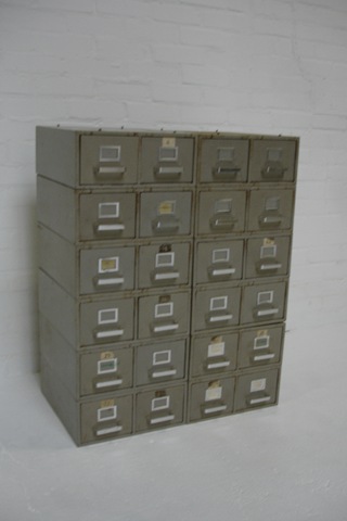 Prachtige metalen industriële ladenkast, bestaande uit 12 losse blokken van 2 laden. Je kan de kast zelf plaatsen/ samenstellen hoe jij het wil. Door een pen- verbinding staan de blokken stevig op elkaar. De voorkant is voorzien van metalen ‘naam’ plaatje. Doet denken aan de Gispen stijl. In goed gebruikte vintage staat. Afmetingen: H90 x B72 x D40 cm. Absoluut in stoer & een blikvanger in je kamer. Prijs: verkocht