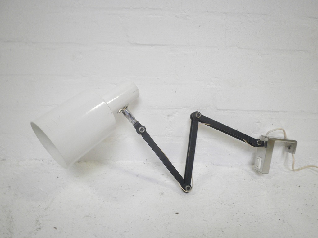 Industriële schaarlamp, mooi door zijn eenvoud. Voorzien van een trekmechanisme waardoor de lamp in ieder gewenste richting is te stellen.Herkomst land Italië. Deze lamp is gemerkt in de arm: Brevettato. De diameter van de kap is 12 cm. In uitgestrekte vorm is de lengte 84 cm en de lengte van de kap 24 cm. Deze lamp heeft prachtige scharnieren. Heb jij oog voor detail en ben jij al enige tijd opzoek naar zo’n exemplaar?