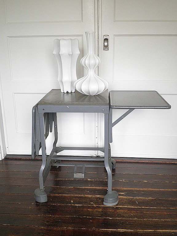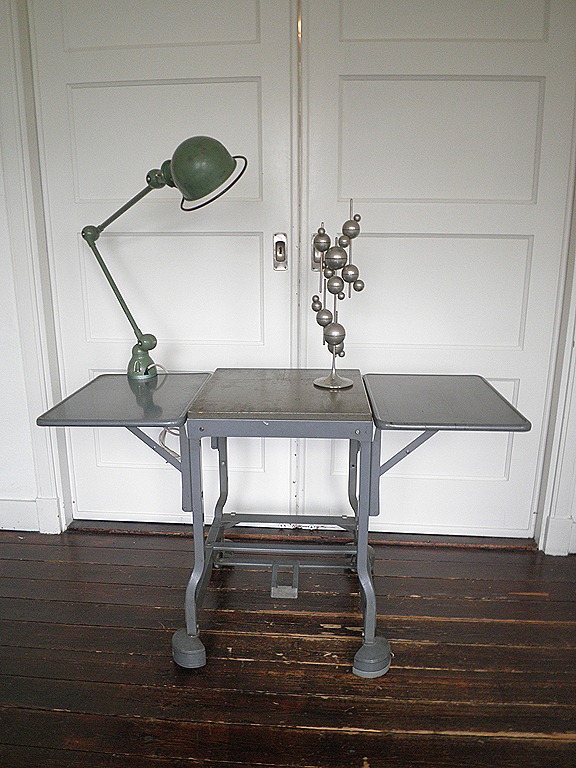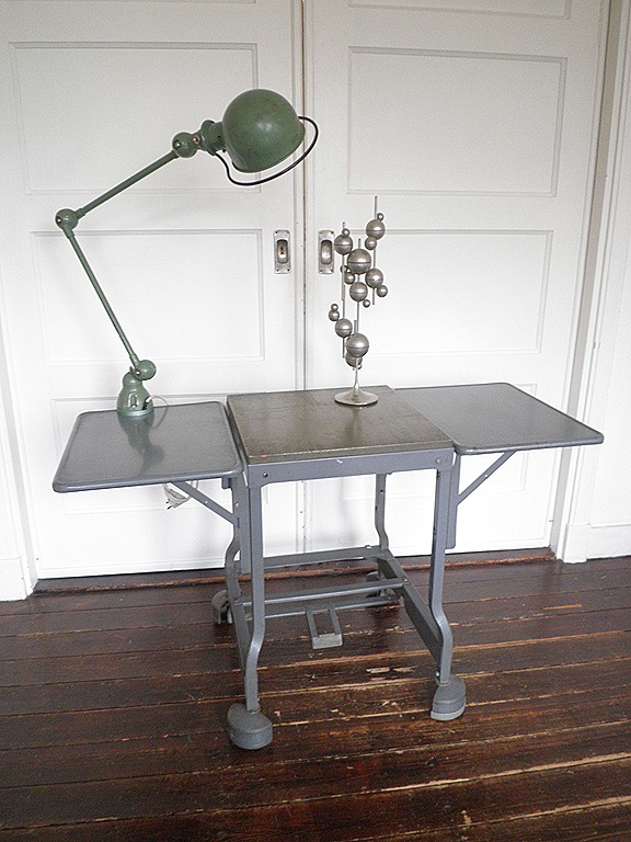 Een zeer bijzonder industrieel exemplaar! Van origine is het een Amerikaanse industriële metalen werktafel ‘the scoop’. Vroeger (jaren 50) gebruikt als typemachine tafel. Gemaakt door Tiffany Stand Co. De tafel is voorzien van twee pop-op 9 inch bladen & 4 zwenkwielen met vergrendelde voetrem. Dus makkelijk te verplaatsen. Materiaal: metaal in combinatie met houten midden blad. Afmetingen: B1.18 (uitgeklapt) x D47 x H70 cm. Hip en stoer als bijzettafel of ideaal als presentatietafel in uw winkel. Gezien zijn leeftijd nog in goede vintage staat met minimale slijtage. Zoek jij altijd net iets anders dan anders? Dan is dit misschien wel helemaal wat jij zoekt! Prijs: verkocht