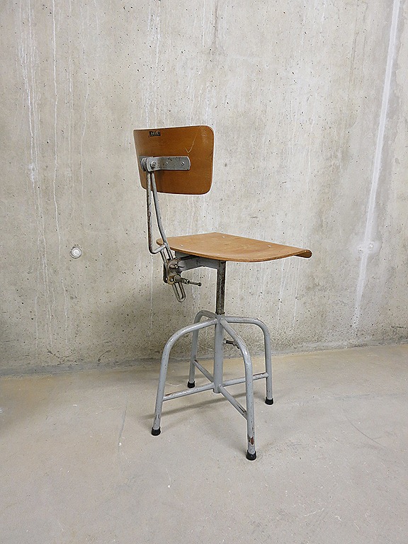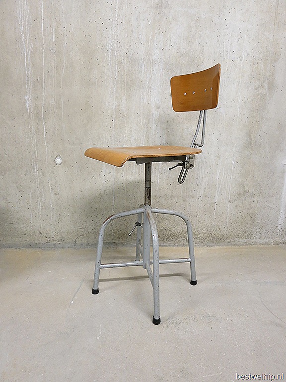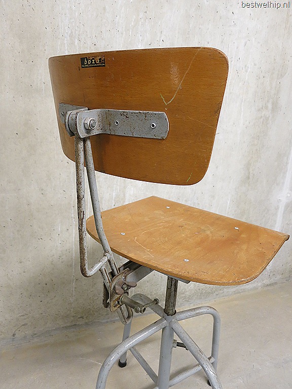 Stoere industriële vintage tekenkruk / werk-kruk. Periode: 1920-1930, Bauhaus stijl. Merk: Bozo, uit Groningen. De achterkant is nog voorzien van origineel merksticker. Prachtig voor achter je tekentafel. In hoogte verstelbaar. Laagste stand 0.45 cm en hoogste stand 0.70 cm. Nog in zeer goede vintage staat. Het metalen frame is prachtig vormgegeven. Prijs: verkocht