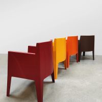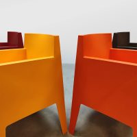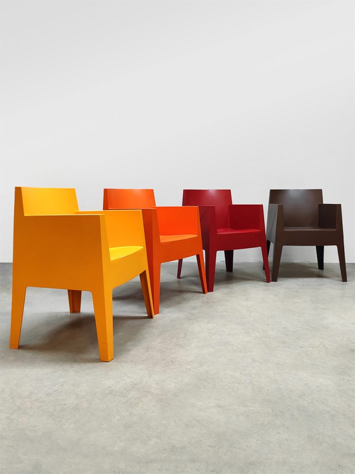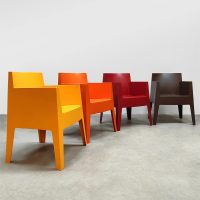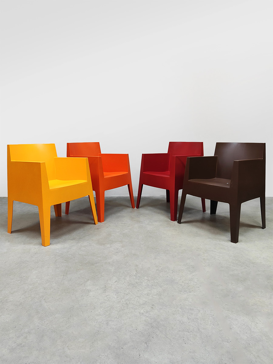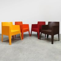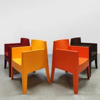 Italian design alert! Deze kunststof Toy chairs is ontworpen door Philippe Starck voor Driade. Ze zijn te gebruiken voor zowel binnen als buiten. Dus ideaal als terrasstoel tuinstoel, conferentie stoel of eetkamerstoel. Land van herkomst: Italië. Deze set heeft een te gek kleurrijk kleuren palet die er zeker uitspringt in je interieur. Makkelijk te plaatsen omdat ze stapelbaar zijn. Deze stoelen set is in een goede conditie. Elk exemplaar is gemerkt aan de onderzijde van de stoel. Heb jij al een mooie plek in je tuin of in gewoon in huis aan de eetkamertafel voor deze vrolijke kleurrijke set stoelen? Summer time it is!