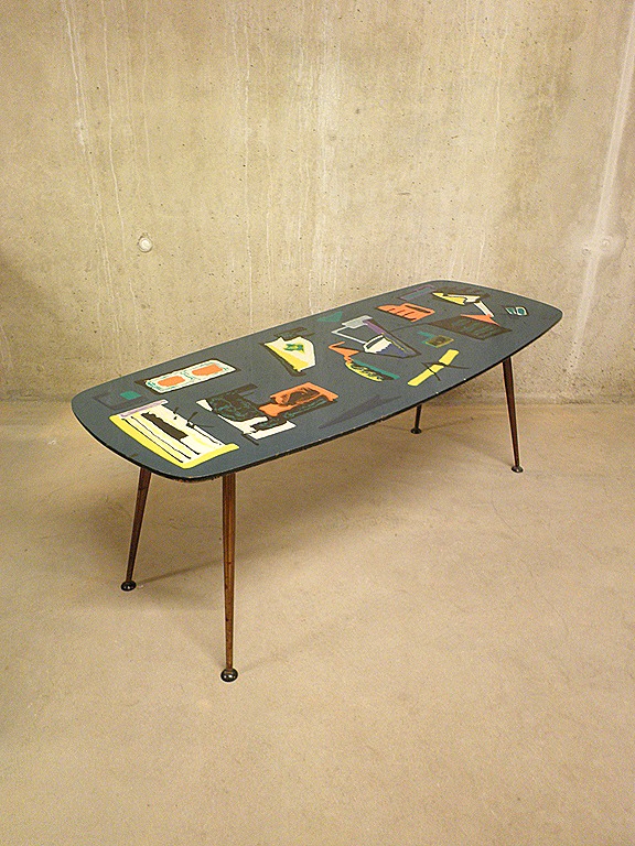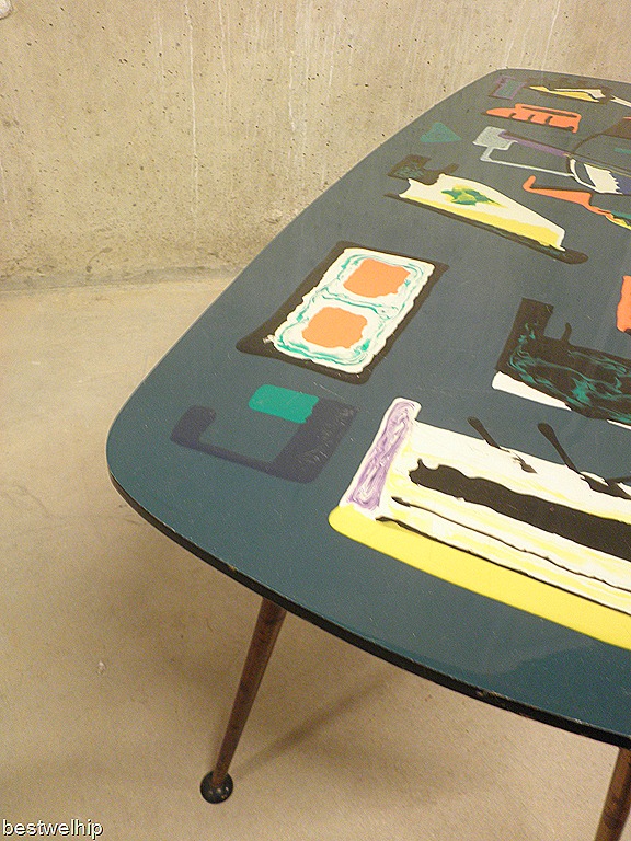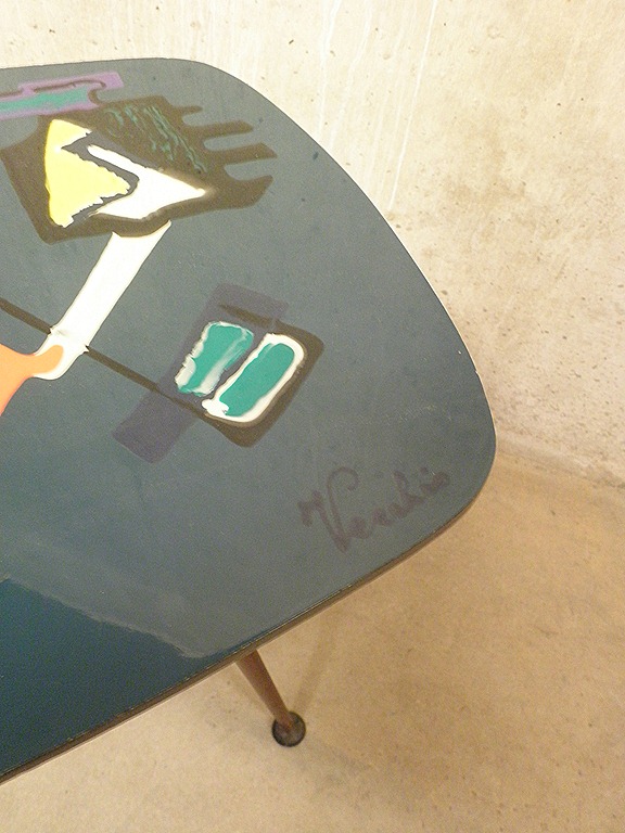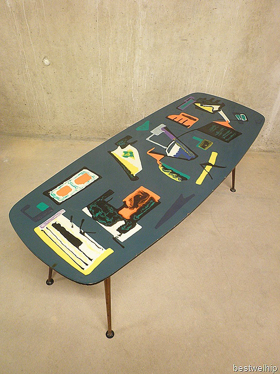 Zeer bijzondere & zeldzame vintage design salontafel / coffee table. Land van herkomst: Italiaans. Periode: jaren 50/ 60. Materiaal: houten blad een prachtige modernistische schildering met epoxy hoogglans top laag, metalen poten. Gezien de leeftijd nog in goed gebruikte vintage staat, enkele gebruikssporen zoals kleine chips & krasjes maar desalniettemin een prachtig exemplaar. Uniek in zijn soort, one of a kind! De tafel is gesigneerd rechts beneden ‘Vecchio’. Prijs: verkocht