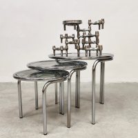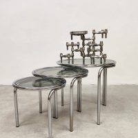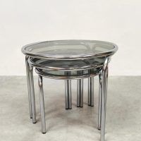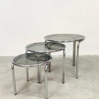 Three of a kind, deze stijlvolle ronde set vintage mimiset, bijzettafeltjes! Periode: jaren 70-80. Voorzien van een rond chromen frame en een smoked glazen blad. Mooi detail is het buisframe waarbij de tafels via een opening in elkaar kunnen schuiven. De tafels variƫren in hoogte waardoor je ze in elkaar kan schuiven en kan neerzetten naar eigen inzicht. Gezien de leeftijd nog in goede vintage staat. Mooi in zowel een strak, modern als vintage interieur. Deze side tables hebben een open uitstraling in de ruimte. Naast bijzettafeltjes ook ideaal om neer te zetten als salontafel/coffee table. Absoluut een tijdloos design!