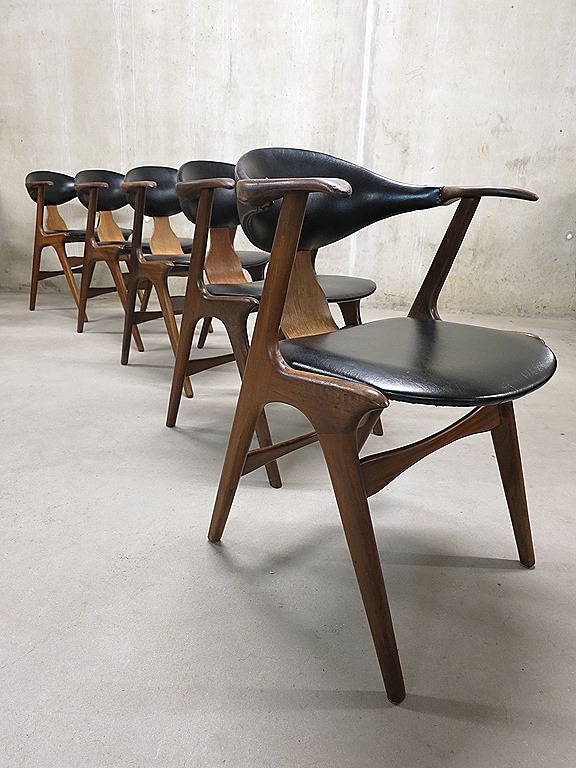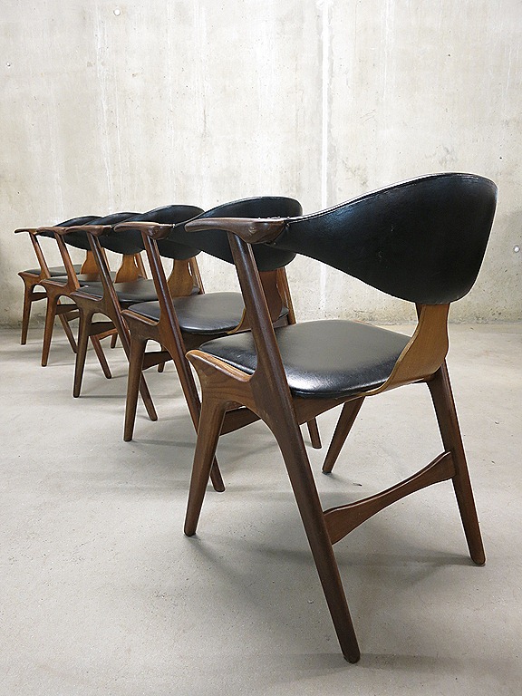 Unieke set van vijf prachtige vintage koehoorn stoelen. Bijzonder vormgegeven armleuningen en rug gedeelte. Fabrikant: de Berk B.V. Vlaardigen. Periode: jaren 60. Het frame is gemaakt van massief teakhout en de zitting en rugleuning is bekleed met zwart skai leer. Nog in zeer goede vintage staat. Afmetingen: H78 x B53 x D48 cm, zithoogte 46 cm. Gemerkt aan de onderkant. Absoluut een bijzondere set eetkamer stoelen met een heerlijke comfortabele zit. Prijs: verkocht