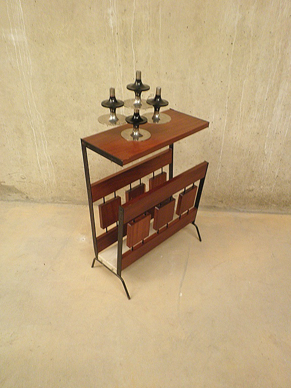 Bijzondere vintage design telefoon tafel/ bijzettafel lectuurtafel in Deense stijl. Periode: jaren 60/70. Stoer contrast tussen het metalen frame met het prachtige warme hout. Afmetingen: B41 x D22 x H52 cm. Nog in goede vintage staat. Heb jij een plekje vrij naast je bank voor dit mooie exemplaar? Prijs: verkocht