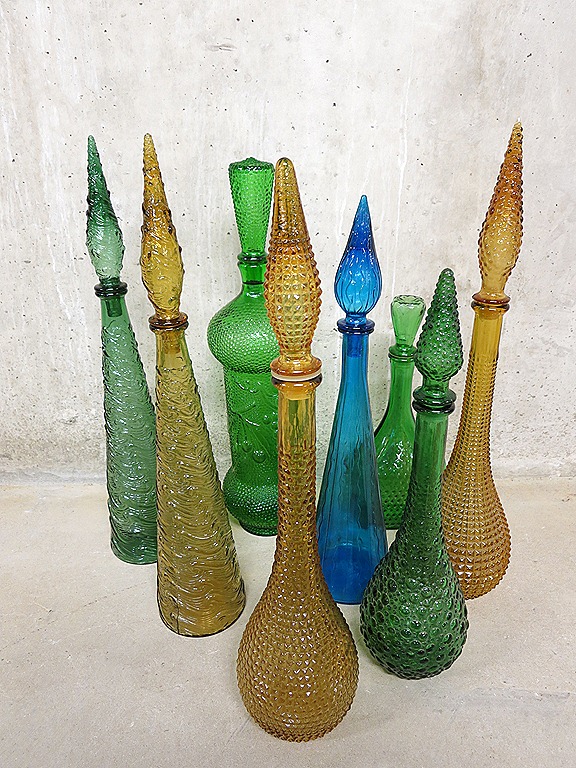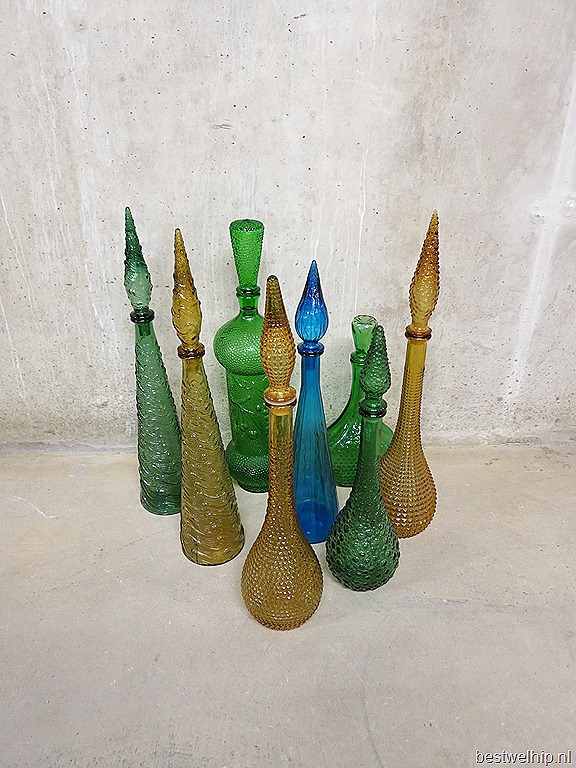 Een prachtige partij stijlvolle Italiaanse vintage design vazen (met stop). Enkele hebben aan de onderkant nog de originele sticker Italy. Een prachtige vondst uit eind jaren 50/ begin jaren 60. Materiaal: hand geblazen glas in mooie flessen groen, geel en zee blauwe kleur. Zeer bijzondere glasoptiek. Nog in zeer goede vintage staat. Prachtig om decoratief neer te zetten in huis.