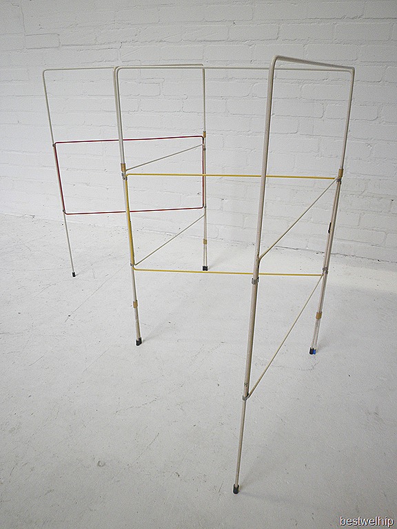 Helemaal vintage is dit opvouwbare metalen hippe rek in Rietveld stijl met de primaire kleur accenten rood en geel. Vroeger bestemd als handdoeken-, was-, droogrek maar ook helemaal leuk om bijvoorbeeld je tijdschriften over heen te hangen. Absoluut bijzonder. Gezien de leeftijd nog in goede vintage staat. Prijs: vekocht