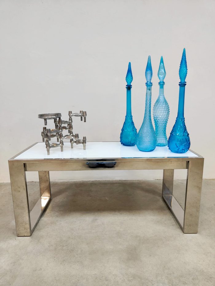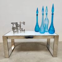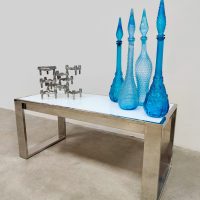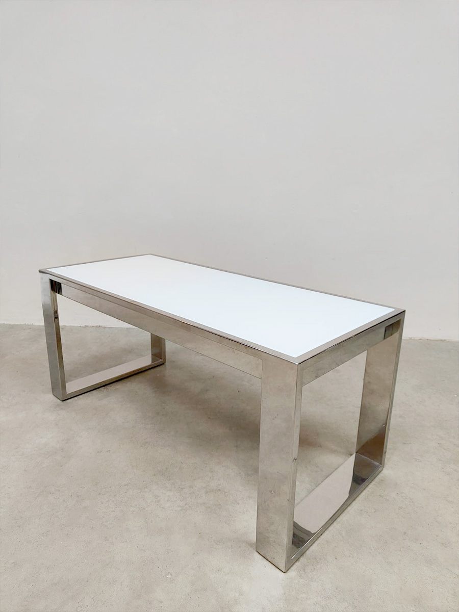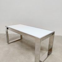 Deze te gekke design bijzettafel/ salontafel van Michael Kors is mooi door zijn strakke vormgeving en past perfect in iedere ruimte. Het strakke chromen frame & wit melkglazen blad zorgt voor een modern en minimalistisch karakter. Deze salontafel past door zijn tijdloze uitstraling perfect in zowel een vintage als modern interieur. Gezien de leeftijd is deze tafel in een goede vintage conditie. Heb jij al de perfect plek voor deze mooie design bijzettafel?
