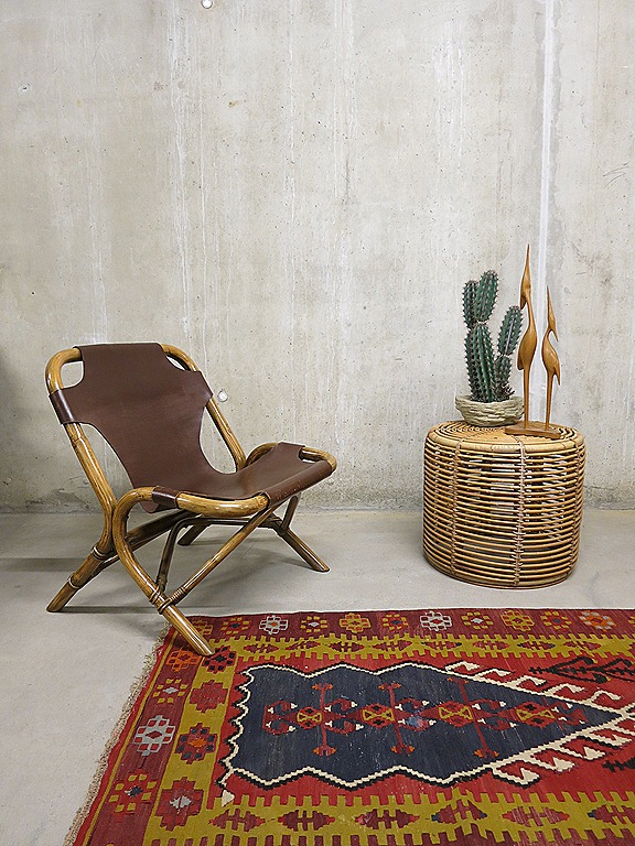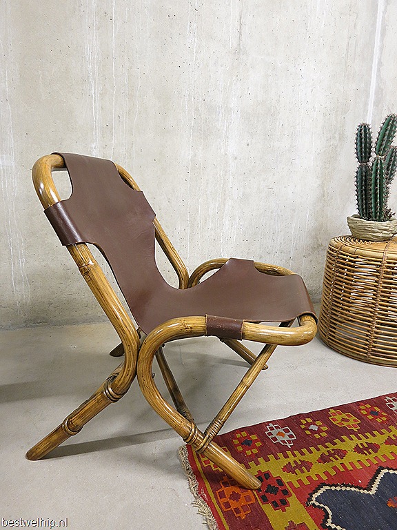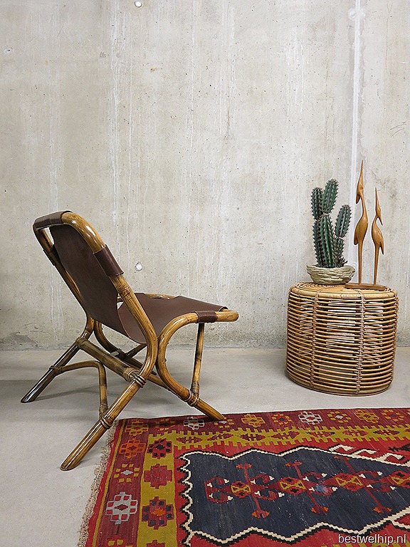 Bijzondere vintage design lounge stoel. Mooi door zijn organische vormgeving. De combinatie tussen het warme bamboe frame en de stoere tuigleren zitting maakt deze stoel tot een uniek exemplaar. Periode: jaren 60/70. Hoogstwaarschijnlijk geproduceerd door Rohe Noordwolde. Nog in zeer goede vintage staat. Door zijn beperkte afmetingen en transparant karakter oogt deze stoel erg ruimtelijk in de kamer. Krijgt dit design object een mooie plek bij jou in huis?