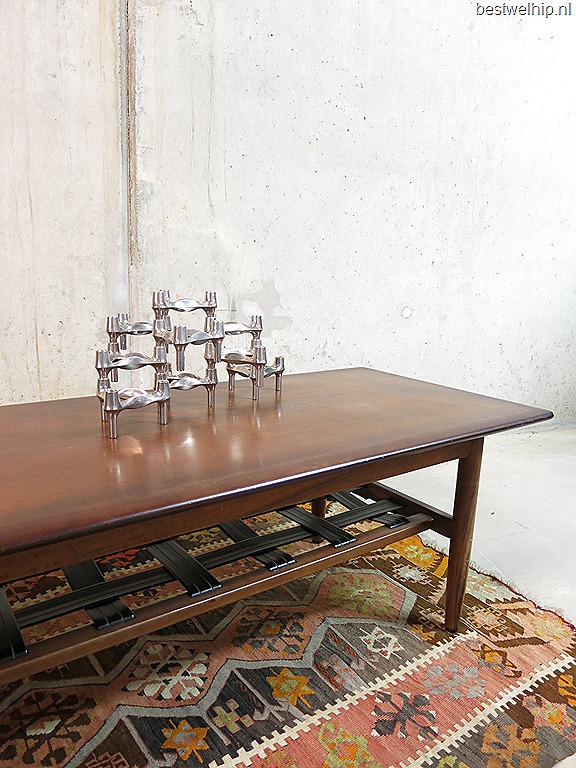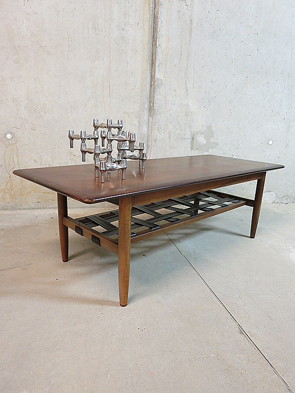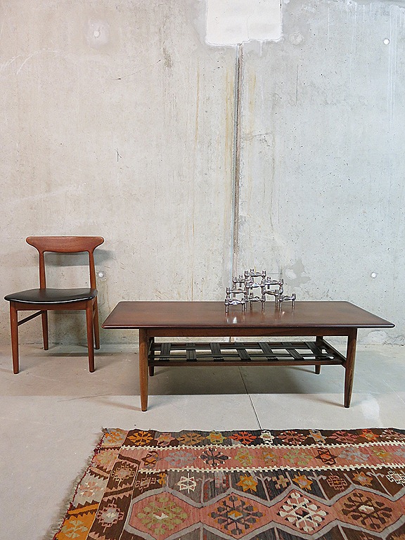 Unieke vintage Deense design salontafel /koffietafel uit de jaren 50. Ontwerper: waarschijnlijk van H. Olsen. Prachtig door zijn eenvoud & voorzien van zwart leren banden aan de onderzijde om lectuur op te leggen. Gezien de leeftijd nog in goede vintage staat. Staat dit exemplaar straks in jouw interieur? Prijs: verkocht