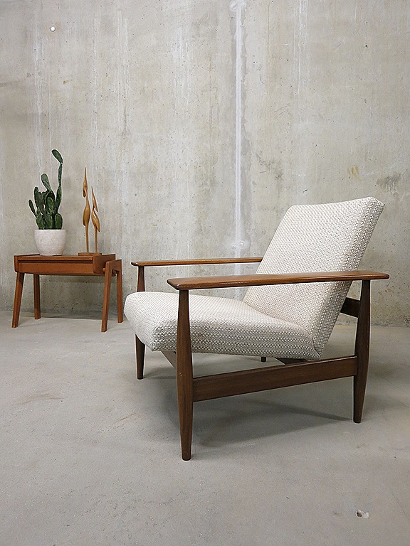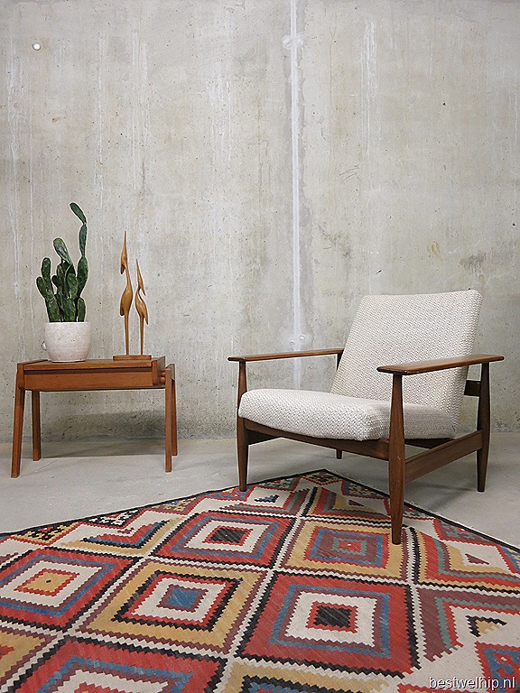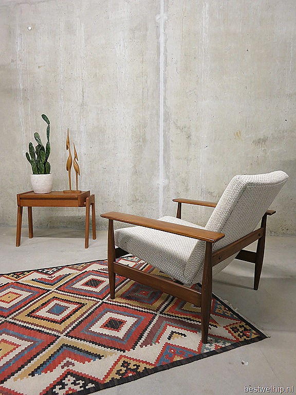 Mooi door zijn eenvoud en strakke lijnen. Periode: jaren 50. Ontwerper: onbekend. Land van herkomst Denemarken. Bijzonder mooi afgewerkt, zitting lijkt optisch te zweven. Prachtig in deze originele wollen stof. Materiaal: teak houten frame, ecru wollen bekleding. Afmetingen: H74 x B75 x D71 cm, zithoogte 38, zitdiepte 51 cm. Gezien de leeftijd nog in zeer goede vintage staat. Deze fauteuil heeft een zeer comfortabele zit. Bijzonder door zijn strakke minimalistische vormen, met oog voor detail. Doordat deze fauteuil een lage rug heeft, oogt hij ruimtelijk in zijn omgeving. Absoluut ‘one of kind’. Prijs: verkocht