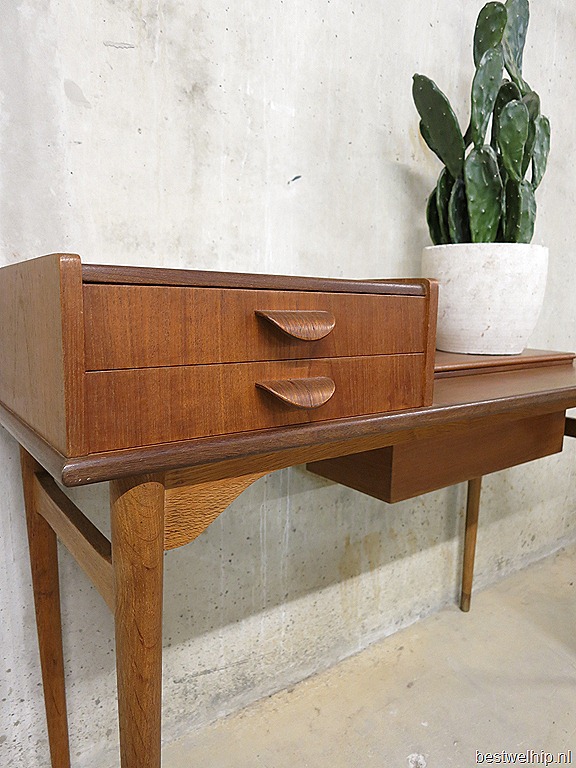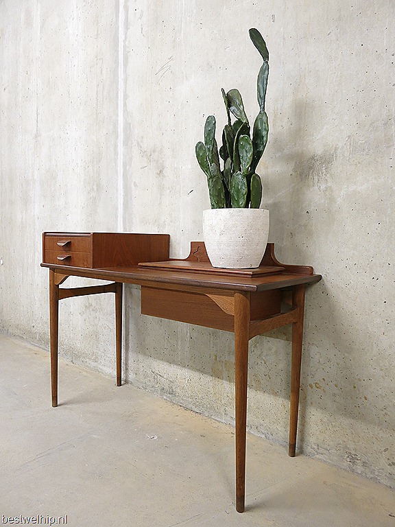 Prachtige Deense teak side table / bijzettafel, voorzien van 2 opberglades en een opberg vak. Periode: jaren 50. Land van herkomst: Denemarken. Kenmerkend is de verfijnde ranke vormgeving en bijzondere handgrepen. Absoluut een zeer mooi en uniek exemplaar met een mooie hout vlam. Te gebruiken als bijzettafel /side table of als kaptafel met een mooi spiegel erboven. De onderkant is gemerkt: Danish. Afmetingen: H72 x B1.01 x D0.39 cm. Hoogte bovenkant blad 0.60 cm, beenruimte tot 0.56 cm. Stijlvol & absoluut ‘one of a kind’. Prijs: verkocht