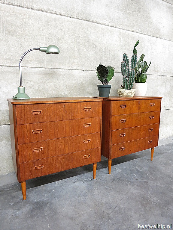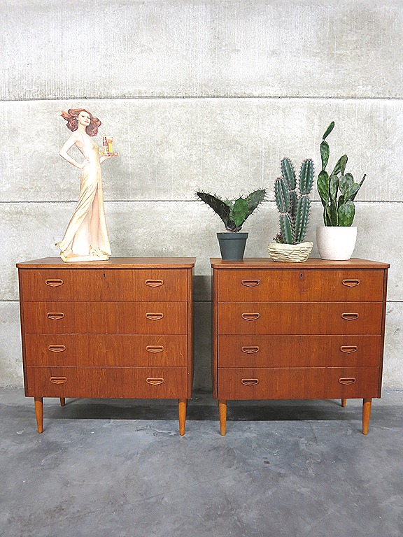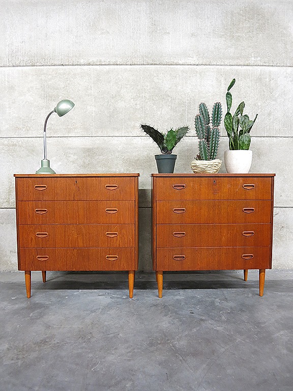 Twee strakke vintage design ladenkasten. Periode: jaren 50. Land van herkomst: Zweden. Ontwerper: onbekend. Materiaal: teak fineer in prachtige hout-vlam structuur. Mooi exemplaar door zijn strakke lijnen & houttekening. De lades zijn voorzien van stijlvolle volhouten handgrepen. Voorzien van 4 lades. Afmetingen: H86 x B83,5 x D41 cm. Gezien de leeftijd nog in goed gebruikte vintage staat. Het blad vertoont ‘n kring/ krasjes maar acceptabel bij een bureau van een halve eeuw oud. Prachtig voor in de (woon)kamer om je spullen in op te bergen. Uiteraard ook gewoon leuk voor aan de wand met een lamp of vaas. Bijzonder dat er 2 identieke exemplaren beschikbaar zijn. Prijs: verkocht