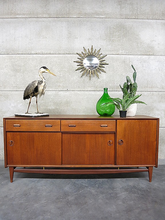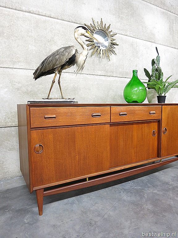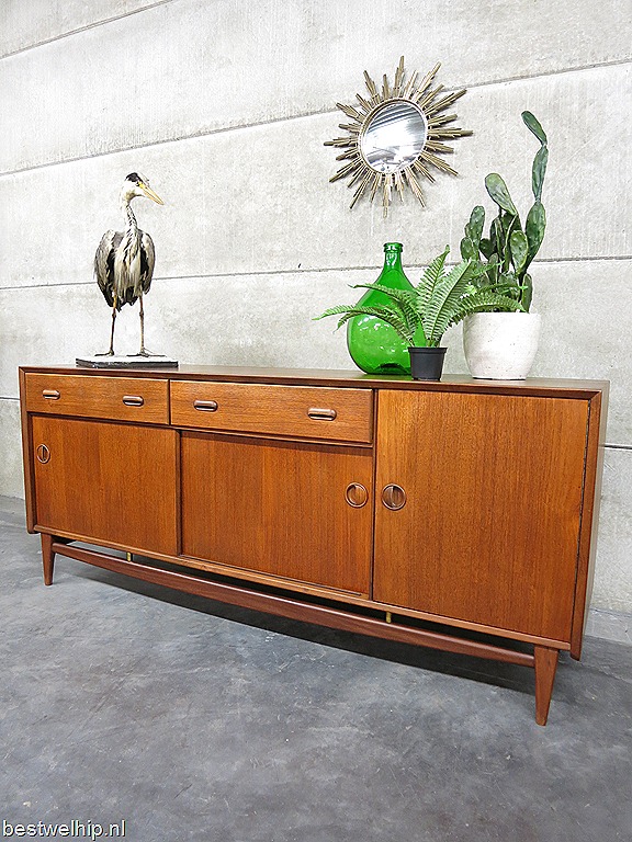 Uniek vintage design dressoir ontworpen door Louis van Teeffelen voor Wébé meubelen uit de jaren. Het dressoir is uitgevoerd in teakhout, voorzien van 1 klapdeur, 2 schuifdeuren & 2 lades. Prachtig door het optisch zwevend onderstel. Afmetingen: B185 x D50 x H80 cm. Het dressoir verkeert in een zeer goede vintage staat gezien zijn leeftijd. Prachtig om neer te zetten, veel opbergmogelijkheid en bijzondere details zoals de bijzonder massief handgrepen. Dit Dutch design dressoir is absoluut een lust voor het oog. Mooi in zowel een vintage als modern interieur! Prijs: verkocht