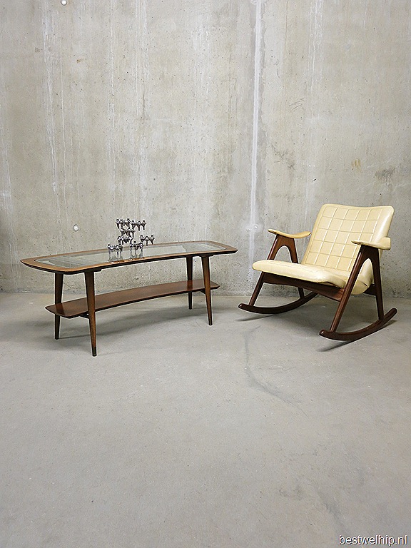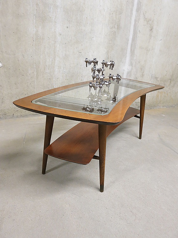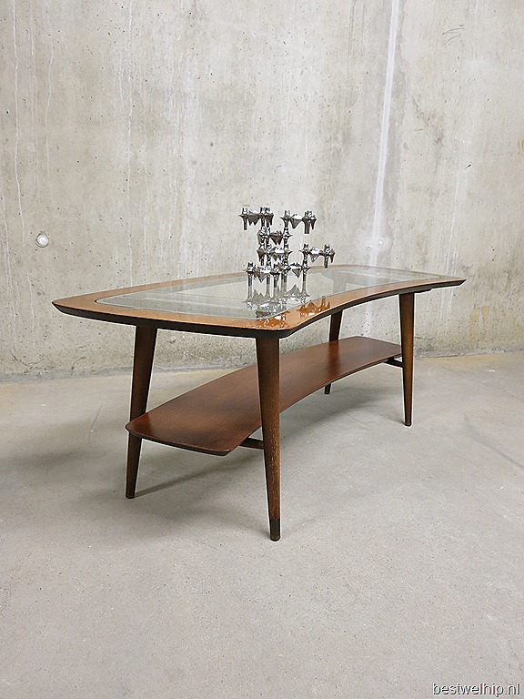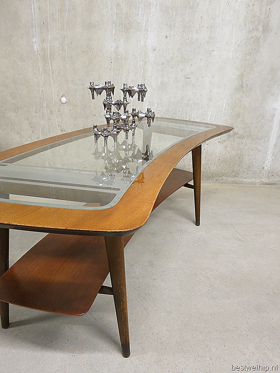 Unieke notenhouten vintage salontafel/coffee table, bijzonder door zijn prachtige niervorm. Ontwerper: naar alle waarschijnlijkheid van Cesare Lacca., producent Cassina. Periode: jaren 50,60. Afmetingen: L1.23x H0.47 x D0.48 cm. Materiaal: notenhout en geslepen glasplaat. Gezien de leeftijd absoluut nog een pracht exemplaar! Door zijn bijzondere vormgeving een juweeltje en een eye-catcher in je woonkamer. Absoluut iets voor de liefhebber! Prijs: verkocht