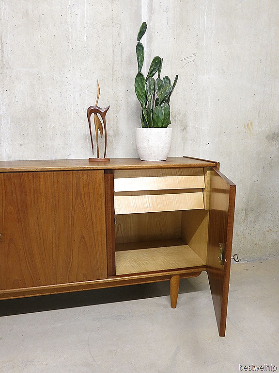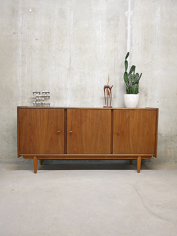 Strak en stijlvol Scandinavisch dressoir. Materiaal: een combinatie van teakfineer met massief eikenhouten onderstel. Mooie Scandinavische kast met 3 klepdeuren waarbij de rechterkant voorzien is van 2 prachtige schuine schuiflades. De linkerkant is voorzien van een legplank. Deze kast komt uit een set van Arne Hovmand Olsen stoelen en bijpassende tafel allemaal uitgevoerd in teakfineer combineert met massief eiken. Mooi door zijn eenvoud en strakke details. Makkelijk te plaatsen door zijn bescheiden afmetingen: B1.55 x D0.45 x H0.80 cm. Gezien de leeftijd in goede vintage staat. Staat deze kast straks bij jou in huis te pronken? Prijs: verkocht