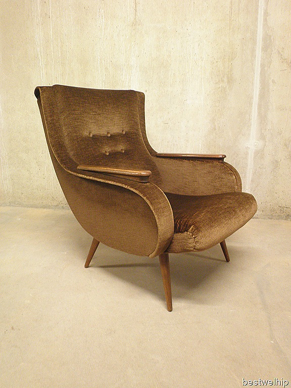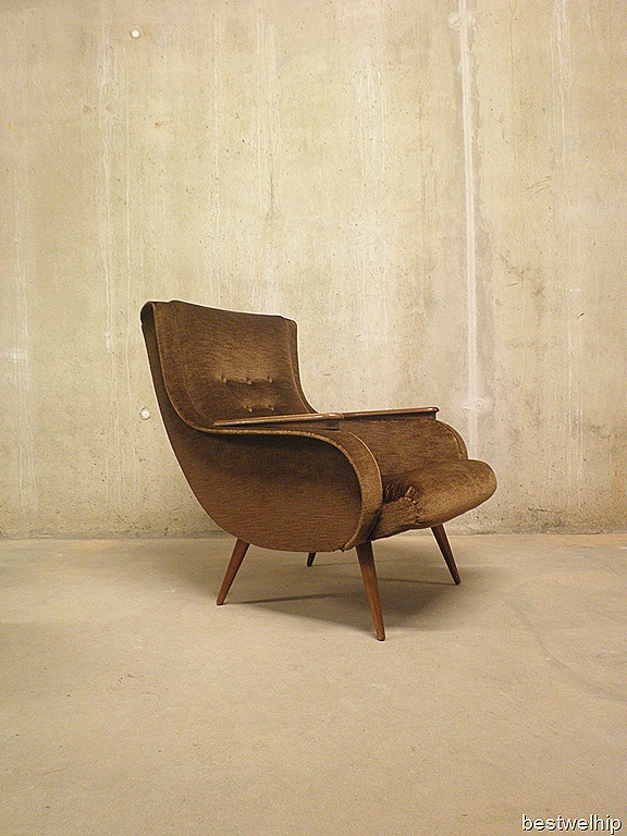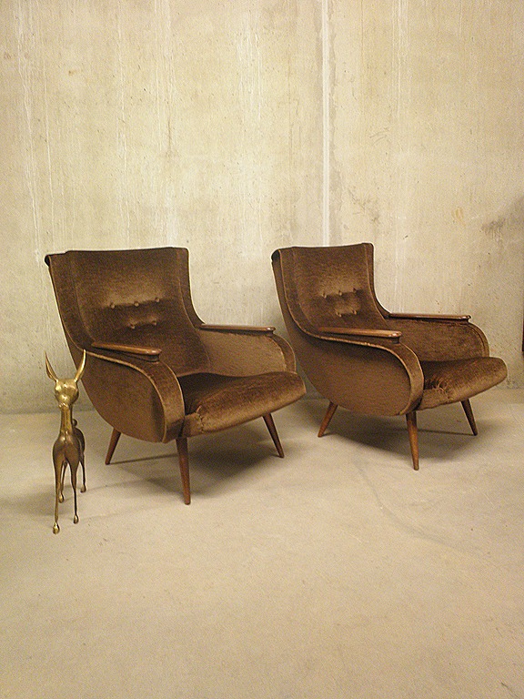 Twee zeer zeldzame vintage design easy chairs uit de jaren 50. Ontwerper: onbekend. Qua vormgeving van de zijkant doet het denken aan Zanuso marco. Door zijn prachtige houten armleuningen ook een knipoog naar de Papa bear chair. Materiaal: bruin velours, prachtige houten armleuningen en schuine poten. Afmetingen: B73 x D83 x H86 cm. Zithoogte 40 cm, zitdiepte 52 cm. Nog in zeer goede vintage staat. Absoluut een stoelen set op ‘verliefd’ op te worden. Prijs: verkocht