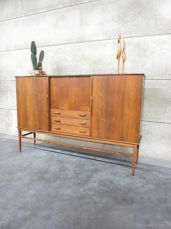 Indrukwekkende vintage design wandkast in Deense stijl. Naar alle waarschijnlijkheid van Fristho (Franeker Holland) Dutch design. Periode: jaren 60. Materiaal: Palissander hout, met een prachtige hout tekening. Het onderstel, evenals de mooie ovale handgrepen zijn gemaakt van massief hout. De smalle lange slanke lijn van deze vintage wandkast maakt deze net even anders dan al die andere dressoirs/ highboards. Voorzien van 3 laden, klep met bureau gedeelte/opbergkast met 2 deuren links en rechts met daarachter legplanken. Dus veel opbergruimte en voorzien van mooie strakke poten. Afmetingen: L186 x D40 x H118 cm. Gezien de leeftijd in goede vintage staat. Dit mooie houten wandmeubel straalt warmte uit en staat prachtig in zowel een modern als in een vintage interieur. Prijs: verkocht