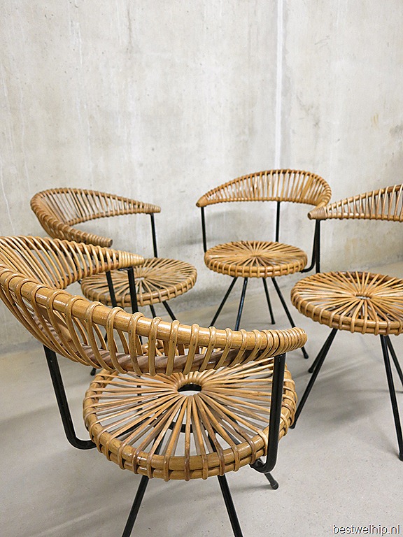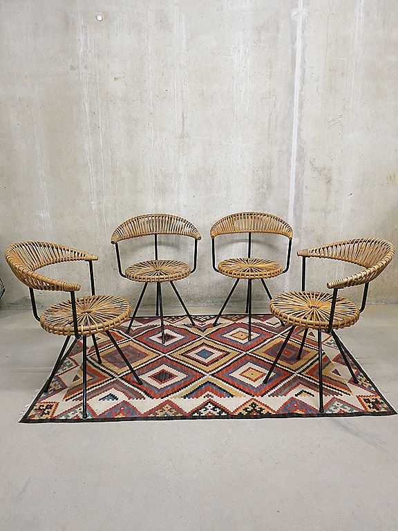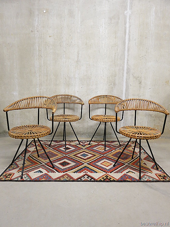 Zeer bijzondere rotan stoelen. Prachtig door zijn eenvoud van Rohe Noordwolde, Holland. Periode: jaren 50. Uitgevoerd in een zwart metalen onderstel / 4 poot en een prachtige rotan zitting. Gezien de leeftijd in goede vintage staat. Unieke stoelen voor aan tafel. Prijs : verkocht