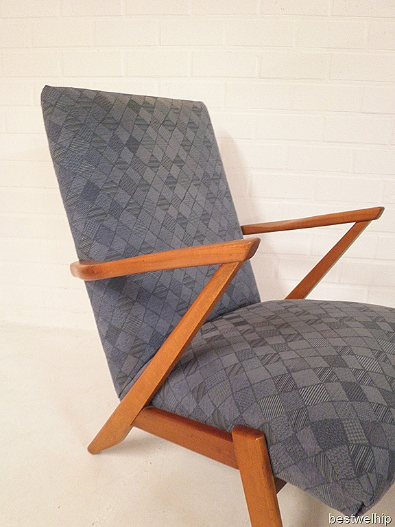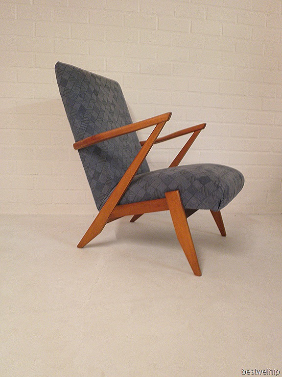 Stijlvolle vintage lounge stoelen/ club fauteuils in Deense stijl. Periode: jaren 50. Bijzondere houten frame ‘Zorro’. Kleur van de stoffering is paars/blauw. Nog in zeer goede vintage staat. Prachtig om bij te zetten in de woonkamer, lounge hoek of in je winkel interieur. Prijs: verkocht
