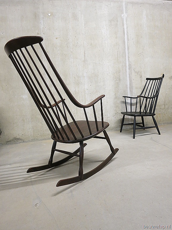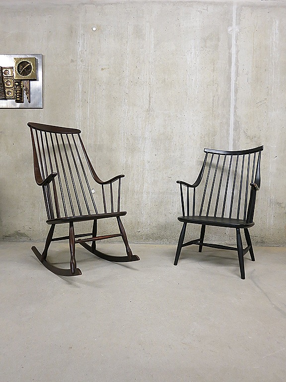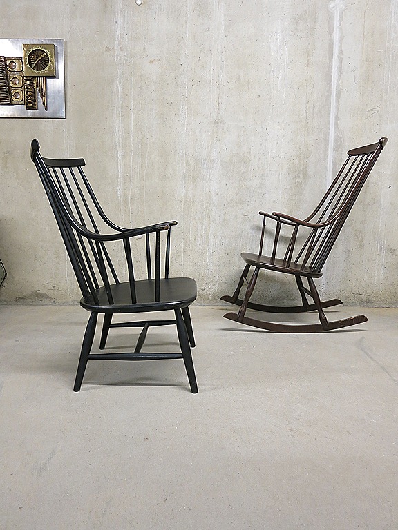 Tijdloos en mooi zijn deze prachtige vintage spijlen stoelen. De spijlen stoel is aan de onderkant gemerkt, Nesto een ontwerp van Lena Larsson voor Pastoe. Periode: 1960. De mooie glooiende armleuning is bijzonder en kenmerkend voor de Nesto stoelen. Gezien de leeftijd beide nog in goede vintage staat. De vintage schommelstoel is donkerbruin en de spijlen stoel is zwart. Prachtig in elke interieur! Prijs: verkocht
