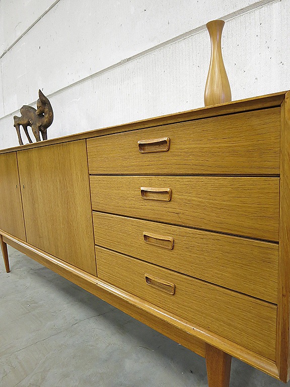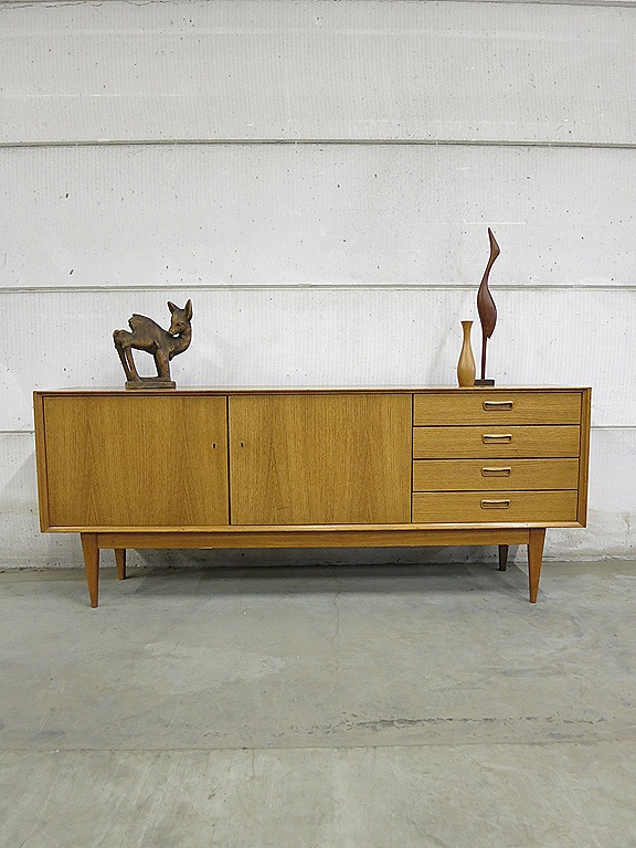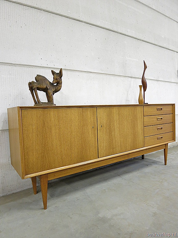 Strak en stijlvol vintage design dressoir uit de jaren 60. Het dressoir heeft aan de voorzijde 2 klapdeuren & 4 schuiflades. Voorzien van strakke vormen en rechte poten. Afmetingen: L 2.00 x D0.45 x H0.81 cm. Het dressoir verkeert in een goede vintage staat gezien zijn leeftijd. Prachtig om neer te zetten, veel opbergmogelijkheid en bijzondere details zoals de massieve strakke handgrepen. Dit Dutch design dressoir is absoluut een lust voor het oog. Mooi in zowel een vintage als modern interieur! Prijs:verkocht