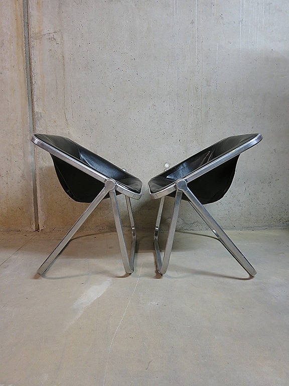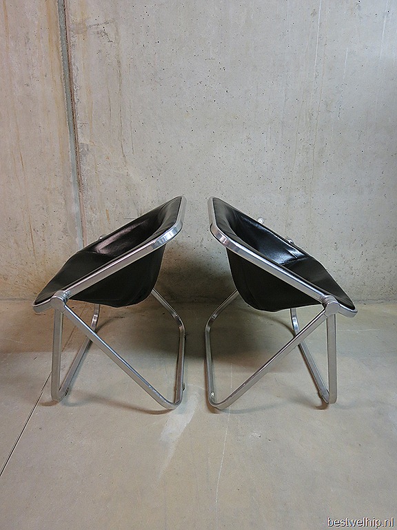 Bijzonder vormgegeven vintage design fauteuil/ kuipstoel & klapstoel. Periode: 1969. Een ontwerp van Giancarlo Piretti. Fabrikant: Castelli. Land van herkomst: Italië. Model: Plona chair. Deze stoel is familie van de bekende Plia stoel, ook van dezelfde ontwerper. Het frame is gemaakt van aluminium en de zitting is van zwart leer. Afmetingen: H72,5 x B86 x D52 cm. Zithoogte 42 cm , zitdiepte 37 cm. Gezien de leeftijd nog in goede vintage staat. Deze uitvoering in leer kom je weinig tegen dus bestwel…uniek! Prijs: verkocht