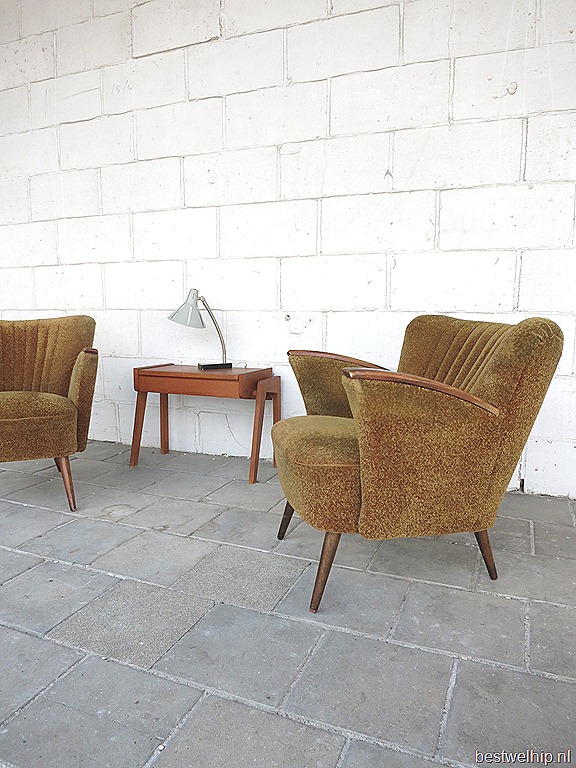 Twee prachtige Dutch design lounge fauteuils/ club fauteuils met bijzondere houten armleggers in Deense stijl. Periode : jaren 50. Ontwerpen onbekend, waarschijnlijk van Artifort. Nog voorzien van originele olijf groene velours stof. Een heerlijke comfortabele zit. Gezien de leeftijd nog in goede vintage staat. Dit zeldzame model is zeer apart door zijn excentrieke vormgeving. Absoluut een eye-catcher in je interieur. Mooi voor thuis maar ook prachtig als lounge hoek in een bar/ café, restaurant of lobby van een hotel. Prijs: verkocht