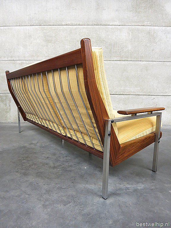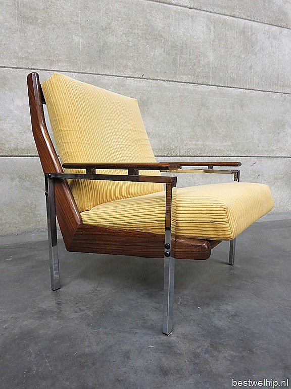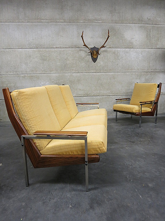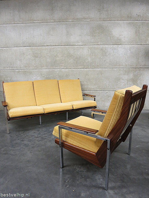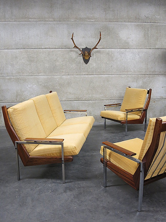 Helemaal te gek is deze ‘mid century’ vintage design lounge hoek, een 3 zits bank met 2 bijpassende fauteuils. Periode: jaren 60. Een ontwerp van Rob Parry voor de Gelderland groep. Materiaal: gele rib velour bekleding, chroom met houten frame, deze heeft een bijzondere houttekening. Afmetingen bank: B195 x D77 x H92 cm, zithoogte 40 cm, zitdiepte 50 cm. Breedte stoel is 71 cm. Gezien de leeftijd nog in goede vintage staat. Zoek jij nog die speciale vintage design bank om een lounge hoek in je hotel mee in te richten, een café/ restaurant of gewoon heerlijk voor in huis.