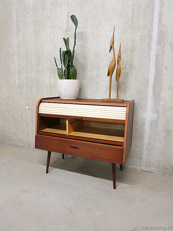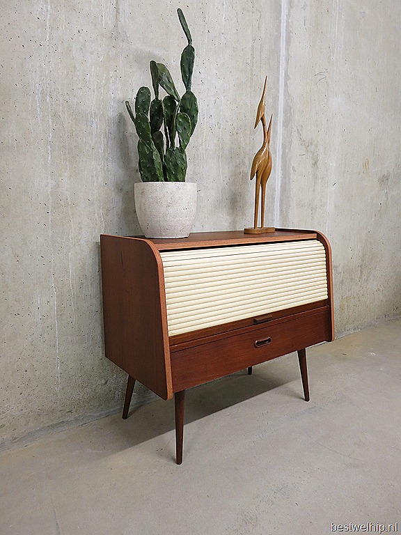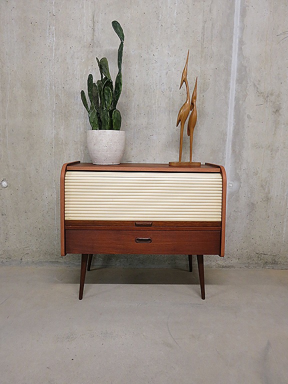 Geweldig Deens vintage wandkastje voorzien van roldeur met daarachter voldoende opbergmogelijkheid. Land van herkomst: Denemarken. Prachtig vormgegeven, op taps toe lopende cocktail poten. Ontwerper: onbekend, doet denken aan Pastoe. Periode: jaren 50/60. Materiaal: teak hout in combinatie met off white kunststof roldeurtje. Makkelijk neer te zetten door zijn beperkte afmetingen B0.76 x H0.67 x D0.37 cm. Gezien de leeftijd nog in goede vintage staat. Ideaal in de woonkamer om je tv op te zetten of je muziek installatie in op te bergen. Uiteraard ook gewoon leuk voor aan de wand met een vaas of kandelaar. Zeer mooi exemplaar door zijn strakke lijnen. Prijs: verkocht