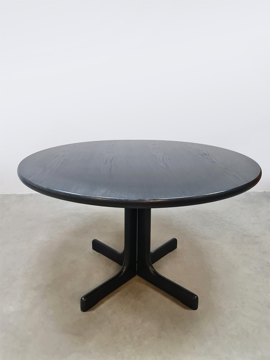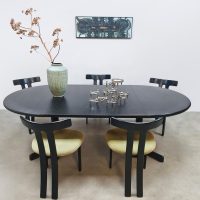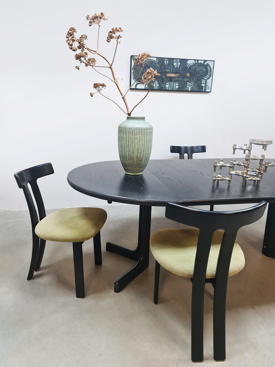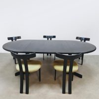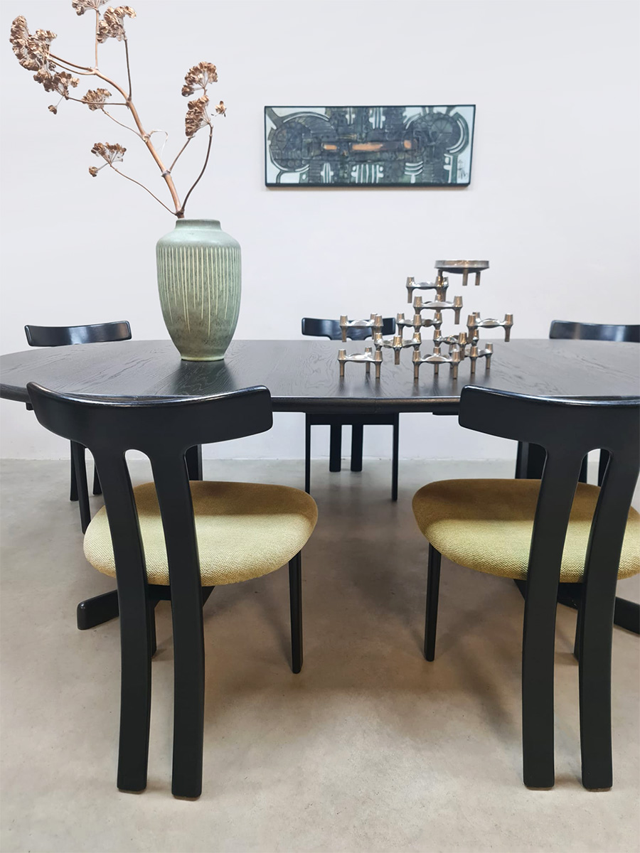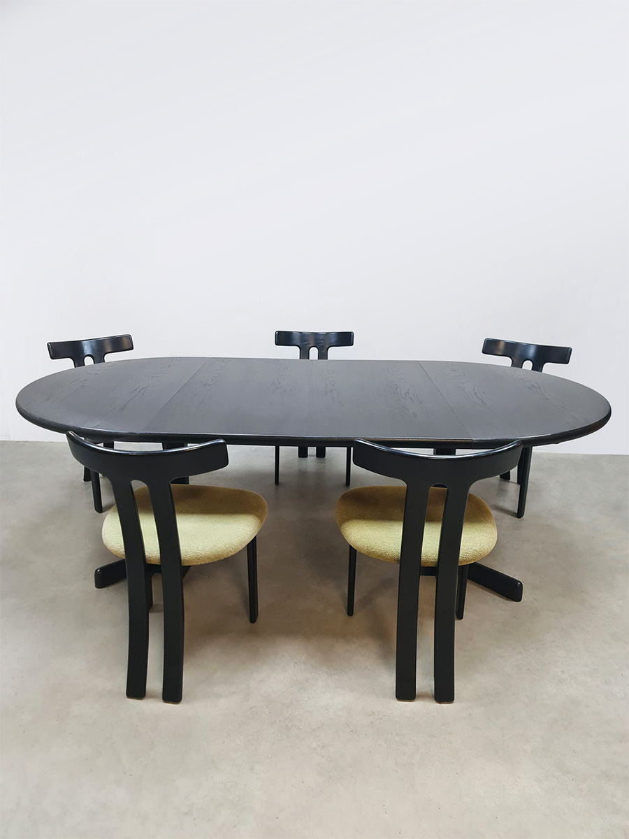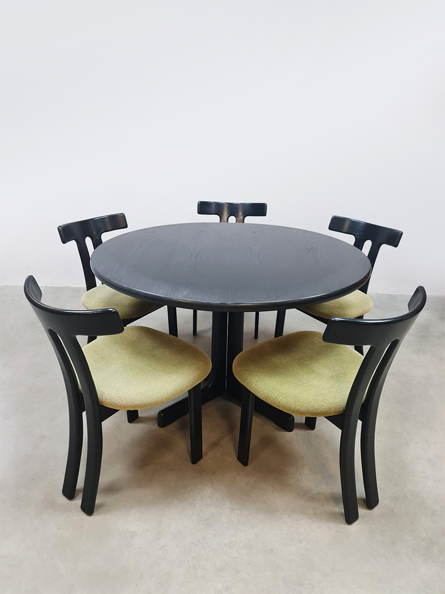 Deze prachtige eetkamerset bestaande uit 5 eetkamerstoelen met uitschuifbare tafel is uit de jaren 60. De stoelen doen denken aan de ‘T-chair’ eetkamerstoelen van Carl Hansen. Maar ook aan de stoelen van Pierre Cardin of aan de eetkamerstoelen van Sapporo voor Mobil Girgi. Dit model is iets anders qua ontwerp. De achterzijde heeft prachtig gebogen houtwerk dat zorgt voor mooie organische ‘T shape’ De voorzijde van de stoelen is strakker, voorzien van sterke rechte lijnen. De stoelen zijn voorzien van een groene stoffen bekleding. De bijpassende zwarte ronde tafel maakt de set helemaal compleet om lekker samen te zitten. De tafel is verlengbaar van 120 naar 220cm. Ideaal voor als er extra gasten over de vloer komen. Absoluut bijzonder vakmanschap uit de jaren 60. Gezien de leeftijd in een mooie vintage staat. Staat deze prachtige zwarte eetkamerset binnenkort in jouw interieur te pronken? What a catch!