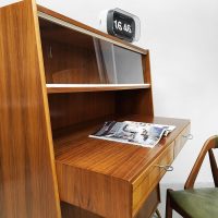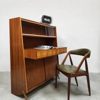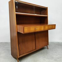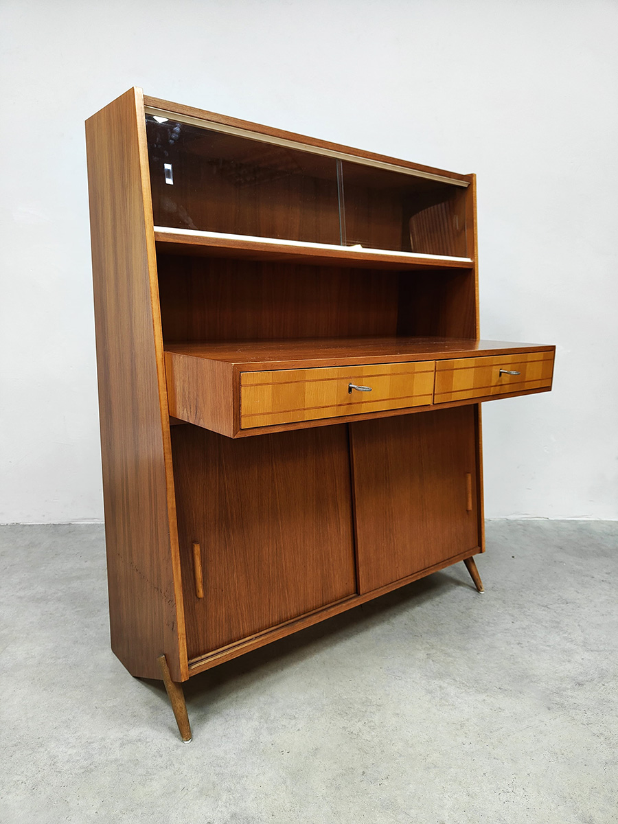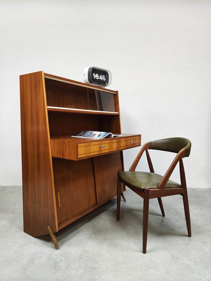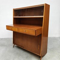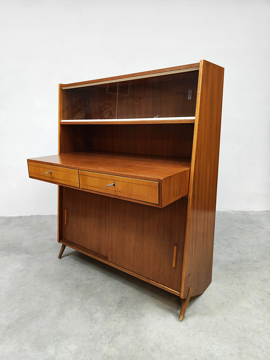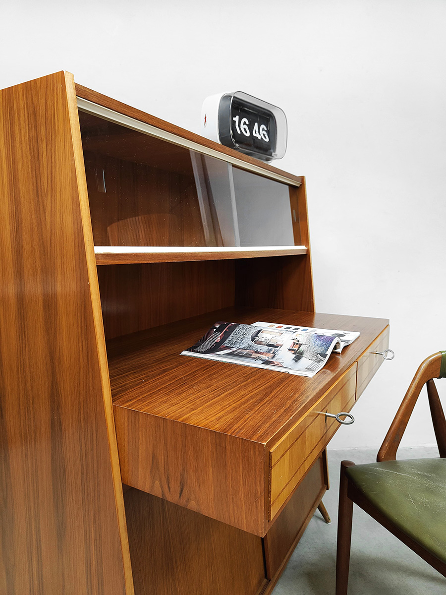 Uniek vintage design secretaire uit de jaren 50 met bijzondere schuine taps uitlopende poten. Dit geeft een bijzonder lijnenspel. Het isĀ een kast en bureau in een! Land van herkomst: Denemarken. Periode: jaren 50. Dit wandmeubel is voorzien van twee schuifdeuren, 2 lades in het uitstekende bureau gedeelte en bovenin is er achter het glas nog ruimte om mooie objecten te presenteren of op te bergen. Gezien zijn leeftijd in goede vintage staat. Ideaal om aan te werken of gewoon decoratief als opberg/boekenkast. Een blikvanger in de kamer. Is jou ook gevallen op dit bijzondere exemplaar? Net even anders dan anders!
