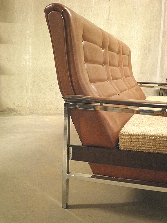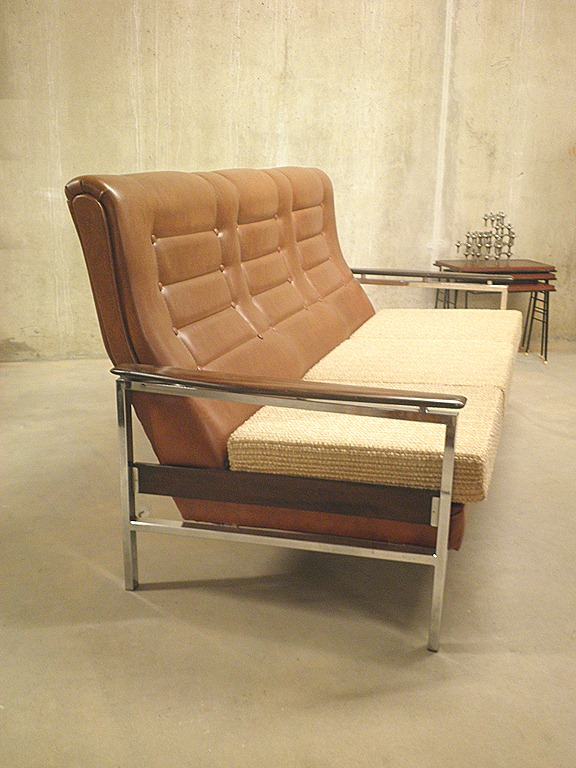 Strak, industrieel en warm tegelijk…deze bijzondere vintage bank is absoluut een eye-catcher in de ruimte! Periode: jaren 60 ‘Mad man stijl/periode’. Waarschijnlijk van Rob Parry, Gelderland groep. Materiaal: chromen frame, houten armleggers, skai leren achterkant en mêlee kleurige kussen. De houten armleggers van wengé lijken opties te zweven. Afmetingen: B1.85 x D0.90 x H0.91 cm, zithoogte is 0.41 cm, zitdiepte 0.52 cm, 3 zitsbank. Nog in zeer goede vintage staat. Zak jij zo meteen onderuit op deze bank met een boek of om heerlijk te relaxen? Prijs: verkocht