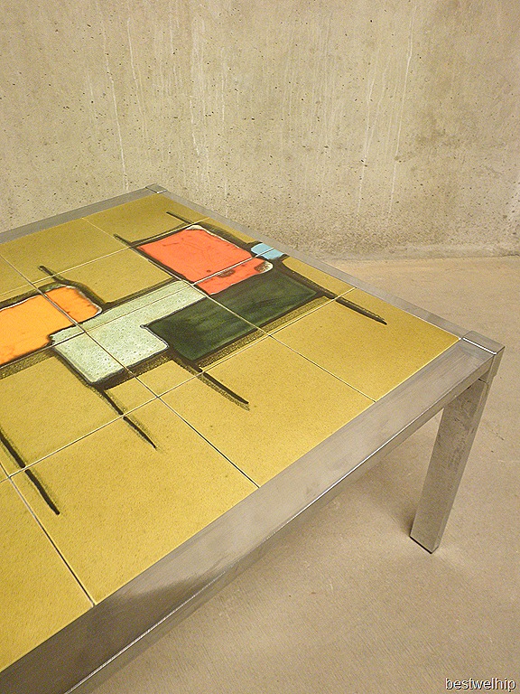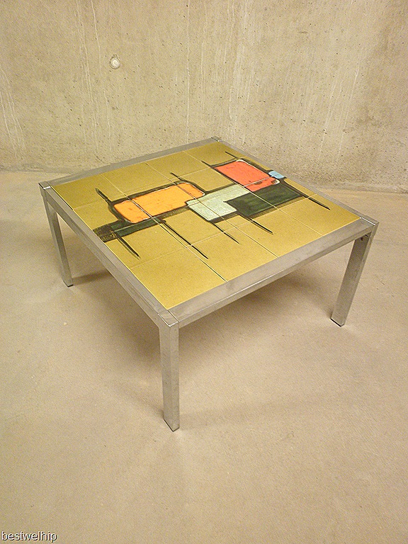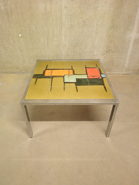 Deze bijzondere vintage tegeltafel zorgt voor kleur in je interieur! Periode: jaren 60/70. Waarschijnlijk een ontwerp van de kunstenaar Belarti ( niet gesigneerd) Prachtige kleurrijke abstracte afbeelding in warme tinten, makkelijk te plaatsen door zijn bescheiden afmetingen. Afmetingen: H37 x B65 x D69 cm.Materiaal: chromen frame en een tegeltafel in abstracte print. Gezien de leeftijd absoluut in goede vintage staat, tegels zijn allen onbeschadigd, ook het chroom in nog in zeer goede staat. Deze vintage design salontafel is stijlvol, eigentijds en stoer tegelijk. Prijs: verkocht