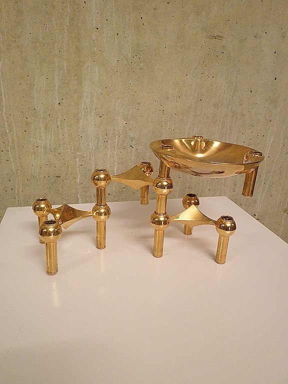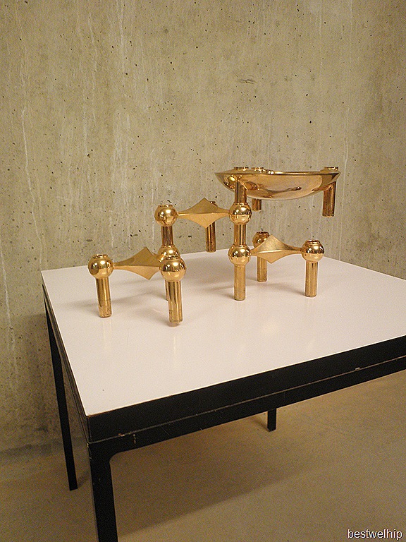 Een originele set van 4 Nagel kandelaars waarvan 1 rond bakje. Periode: 1950. Zeer mooi om kaarsen in te laten branden of gewoon als object om neer te zetten op tafel. Op te bouwen in diverse variaties, waardoor er een creatieve vorm ontstaat. Materiaal: verguld goud kleur. Afmetingen: H6 x B10 cm. Gezien de leeftijd in goede vintage staat. Prijs: verkocht