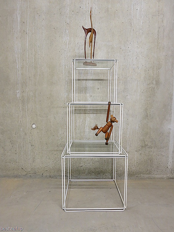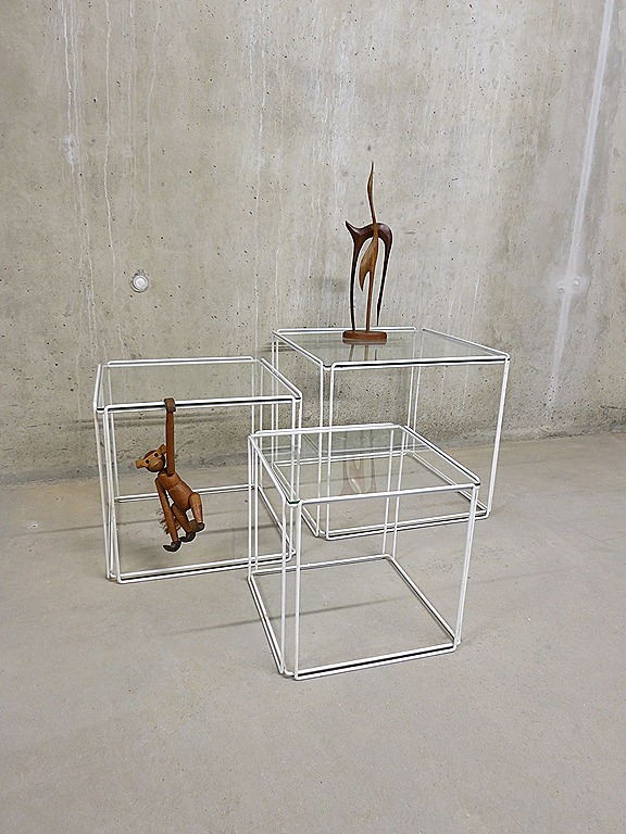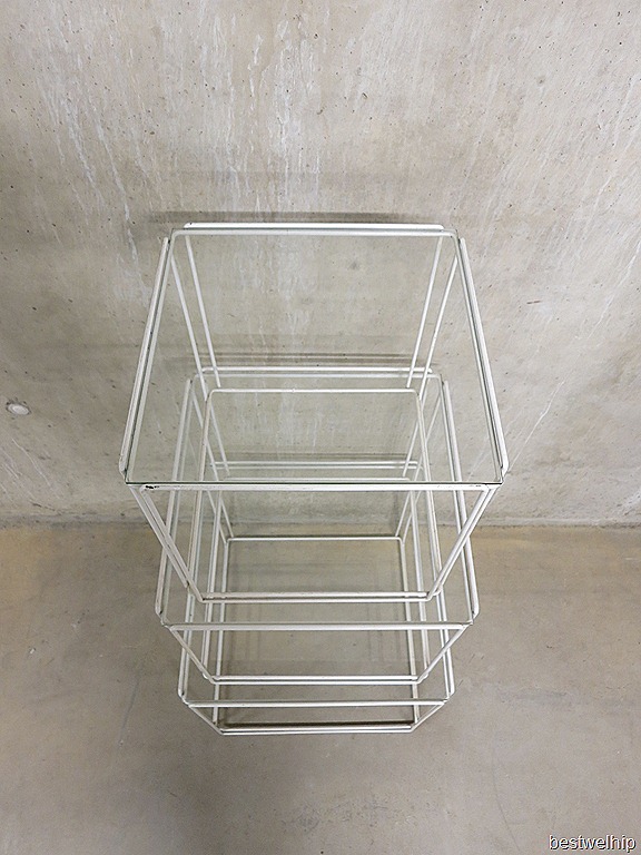 Een stijlvolle kubistische miniset/ bijzettafeltjes , minimalistisch ontworpen door de Franse ontwerper Max Sauze. Producent: Max Sauze studio. Model: Isocele. Land van herkomst: Frankrijk. Periode: jaren 70. Deze vintage kubis tafeltjes hebben een witgelakte draadstalen frame en zijn voorzien van een glasplaat. Het bijzondere is dat er geen schroeven of bouten zijn gebruikt. De tafels zijn variëren in hoogte. De tafeltjes passen volledig in elkaar. Afmetingen: B0.45 x D0.45 x H0.40, B0.35 x D0.35 x H0.37, B0.31 x D0.31 x H0.30cm. Gezien de leeftijd nog in goede vintage staat. Mooi in zowel een strak, modern als vintage interieur. Ze geven een zeer mooie en open uitstraling in de ruimte. Naast bijzettafeltjes ook ideaal om neer te zetten als salontafel/ coffee table. Prijs: verkocht
